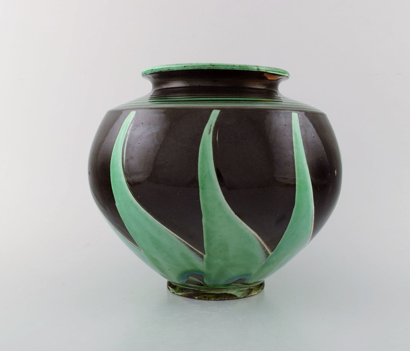 Kähler, HAK, stor glaseret art deco stentøjsvase i moderne design. 1930/40´erne. Smuk glasur. Grønne striber på sort baggrund. Stemplet. Måler : 22 cm. x 20 cm. I perfekt stand.