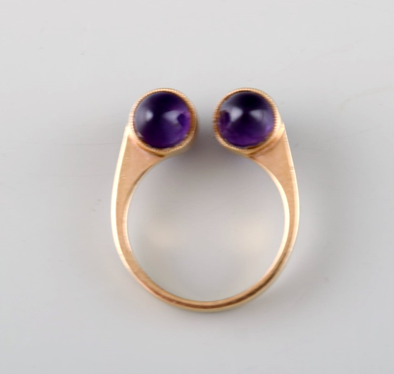 Bernhard Hertz, dansk guldsmed. 14 karat modernistisk guldring prydet med lilla sten. I flot stand. Stemplet. Måler: 17 mm. I de fleste tilfælde kan vi mod et gebyr (kr. 300) pr ring, få ændret størrelsen.