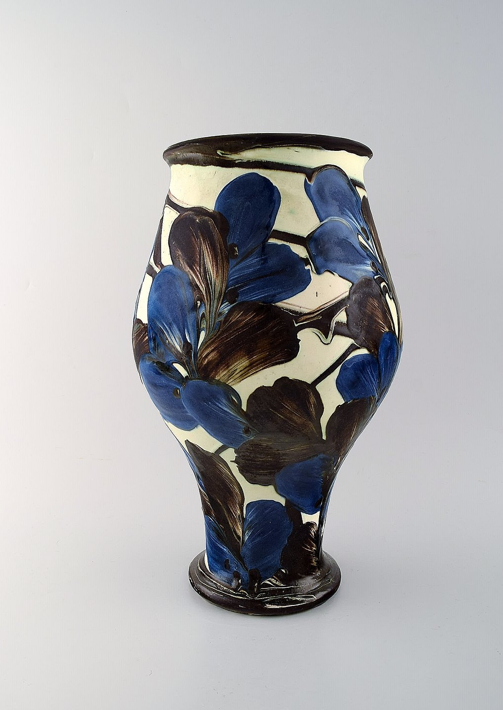Kähler, HAK, stor glaseret stentøjsvase i moderne design. 1930/40´erne. Kohornsteknik. Blomster på lys baggrund. Stemplet. Måler : 37 x 23 cm. I flot stand.