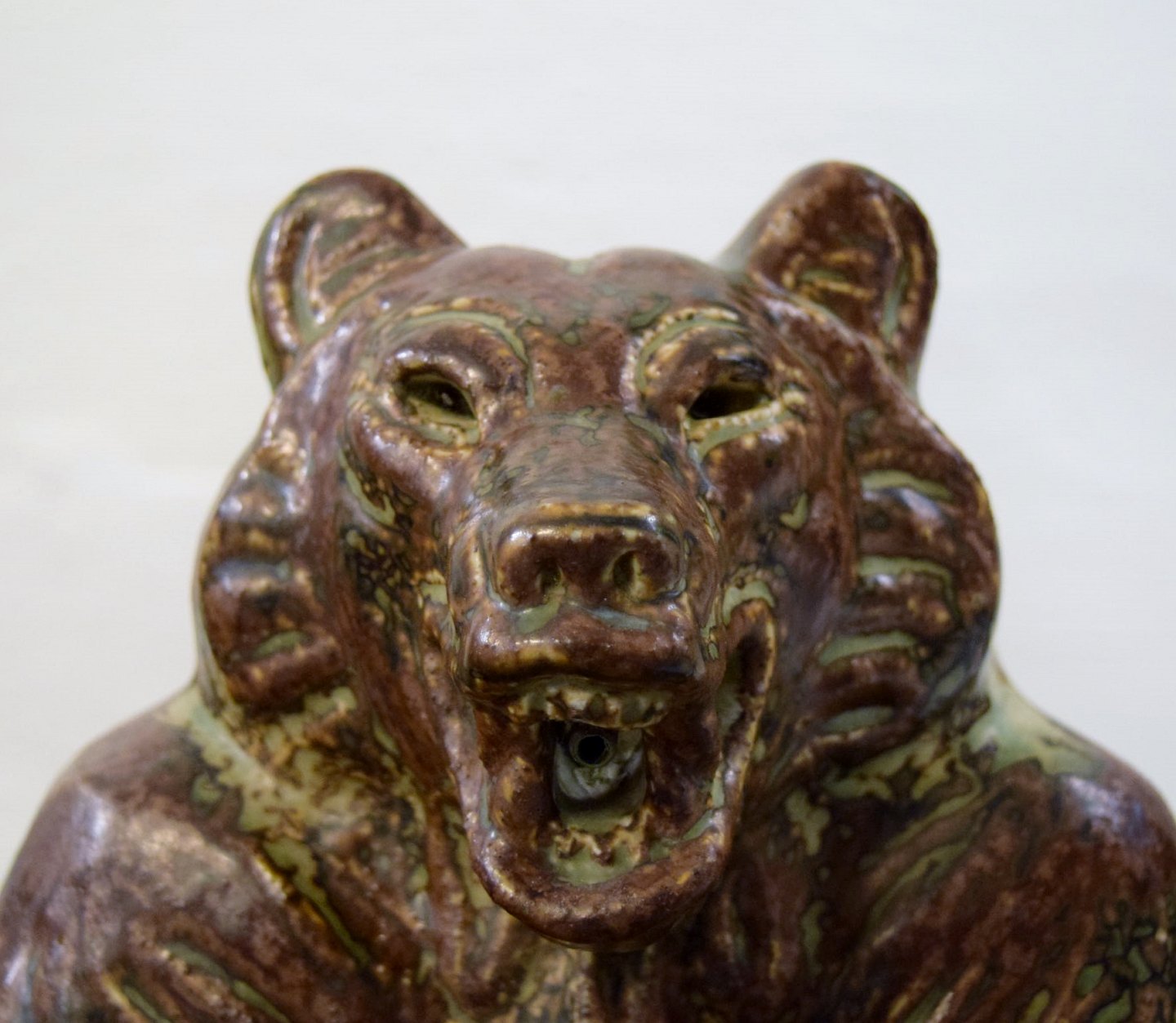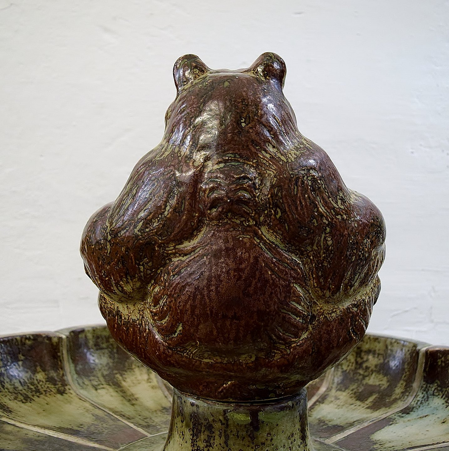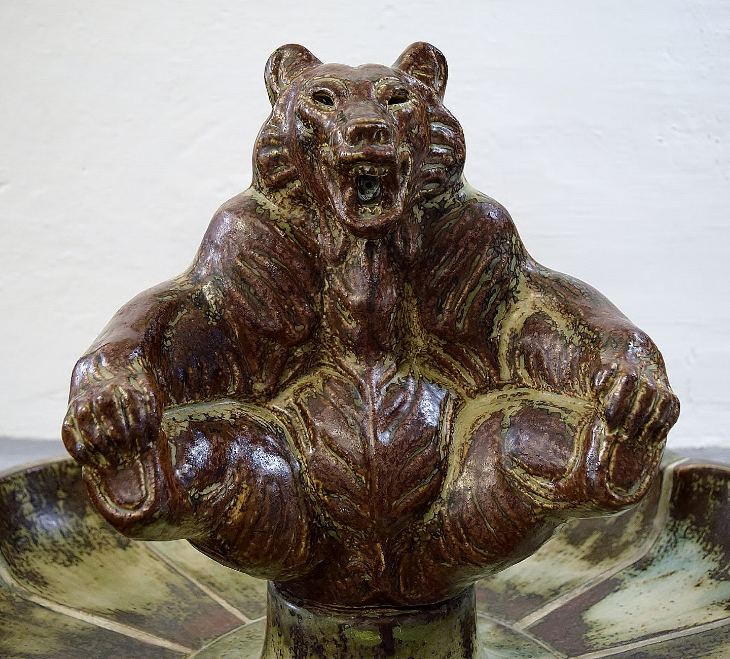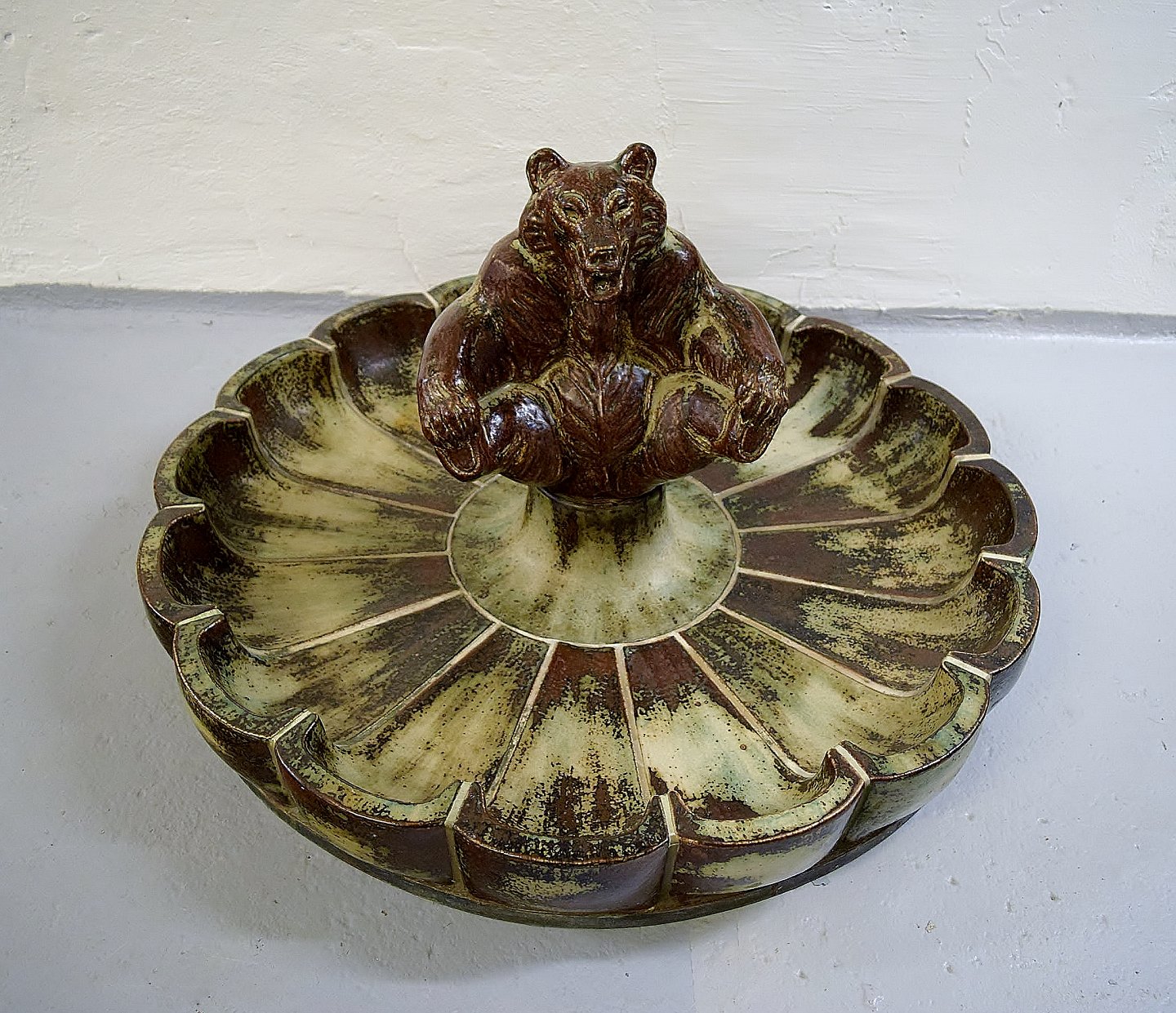 Unika Knud Kyhn for Royal copenhagen. Monumental og tung cirkulær havefontæne af stentøj i svejfet mønster med løstsiddende bjørn i midten. Vandet løber ud af bjørnens mund. Dekoreret med Sung glasur. Sjældent udbudt, museumskvalitet.