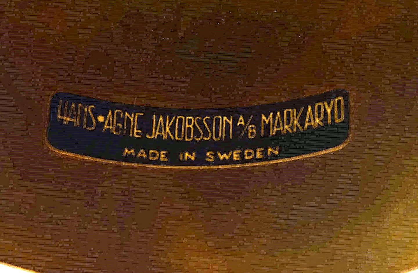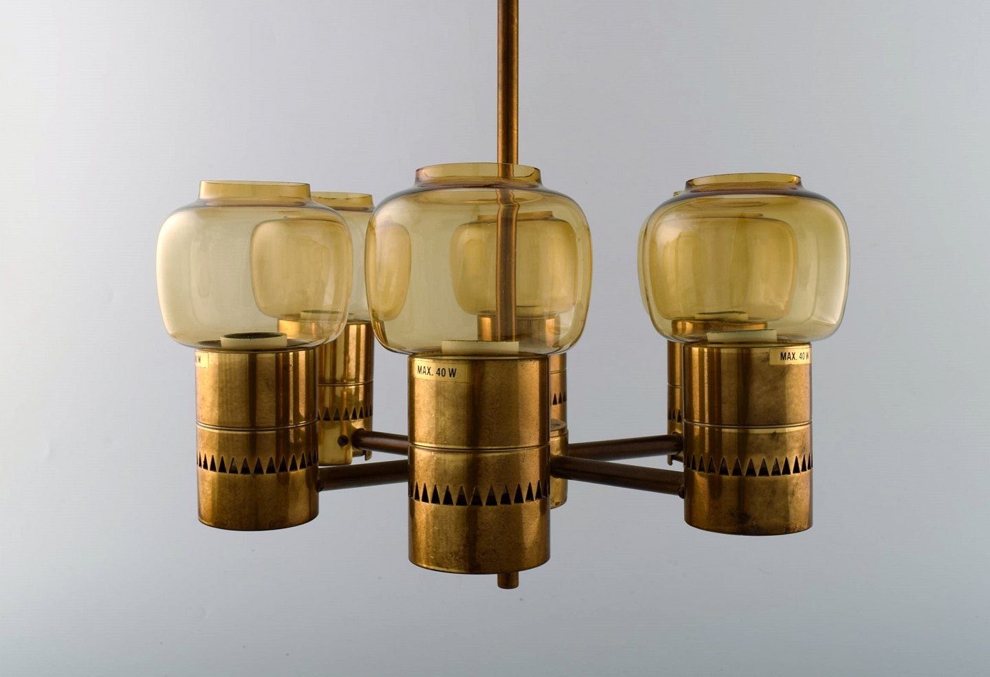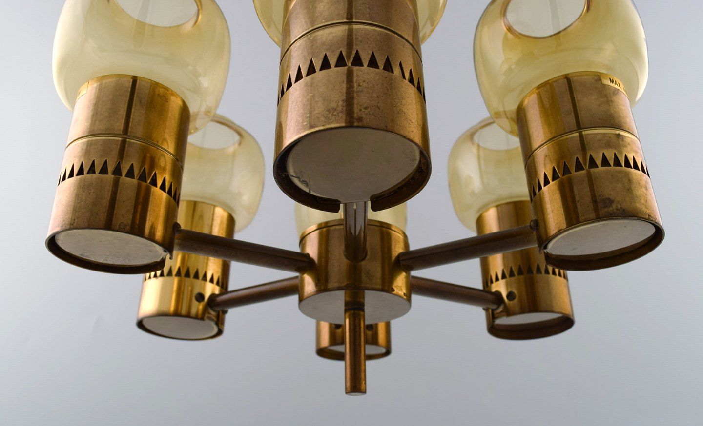 Hans Agne Jakobsson(1919-2009) Seksarmet lysekrone til el af messing monteret med glasskærme. Fremstillet hos Markaryd, Sverige. Ca. 1970.