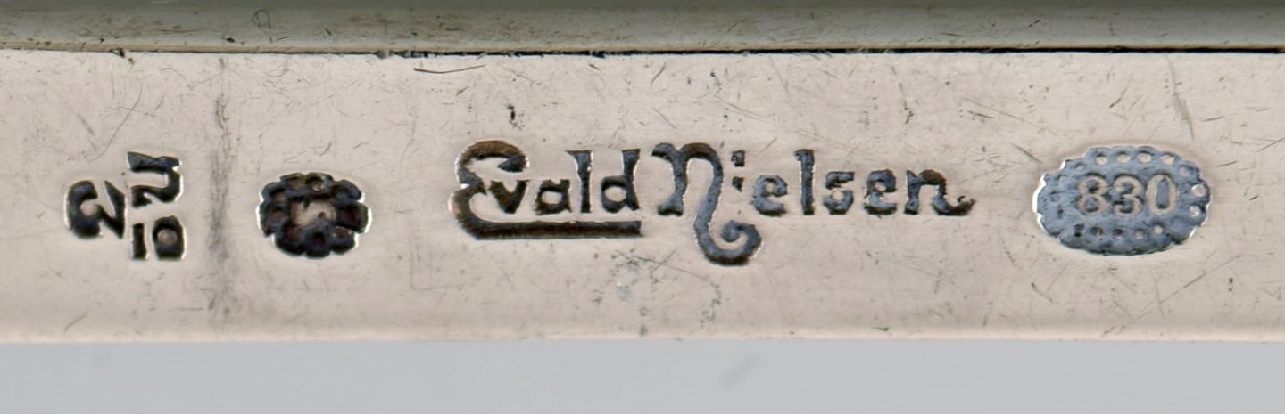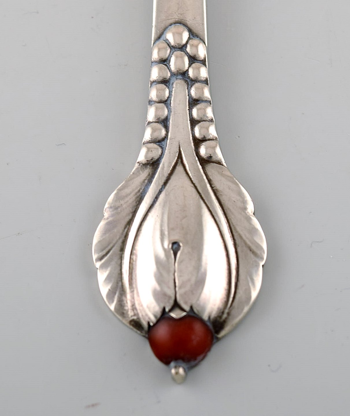 Evald Nielsen number 3, dinner fork in hammered silver (830) with cabochon coral bead. 1920's. 12 pcs in stock. Measures 18 cm. Stamped. In perfect condition.