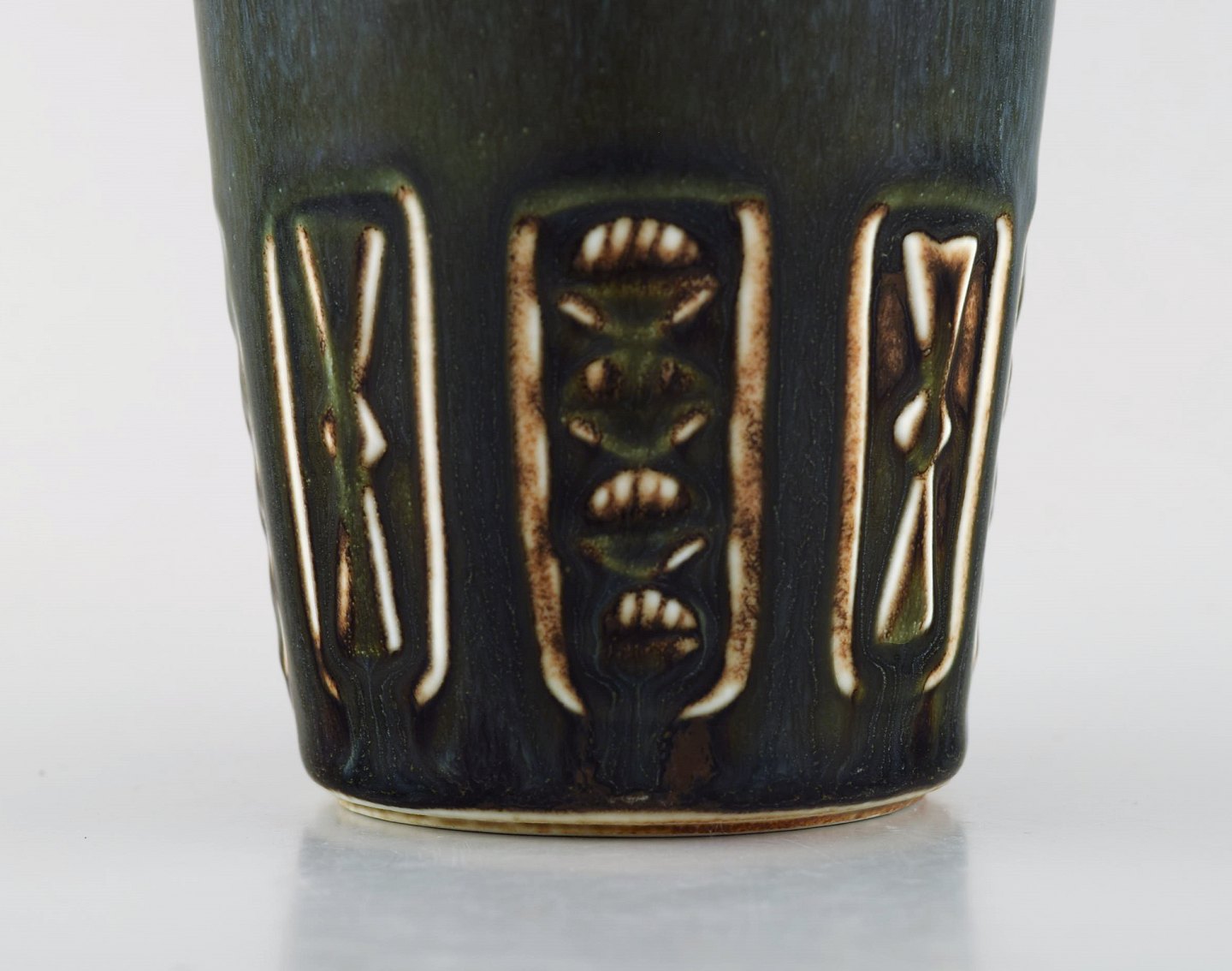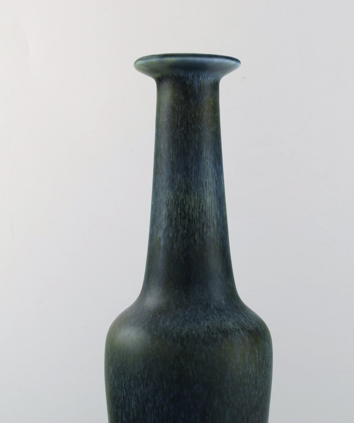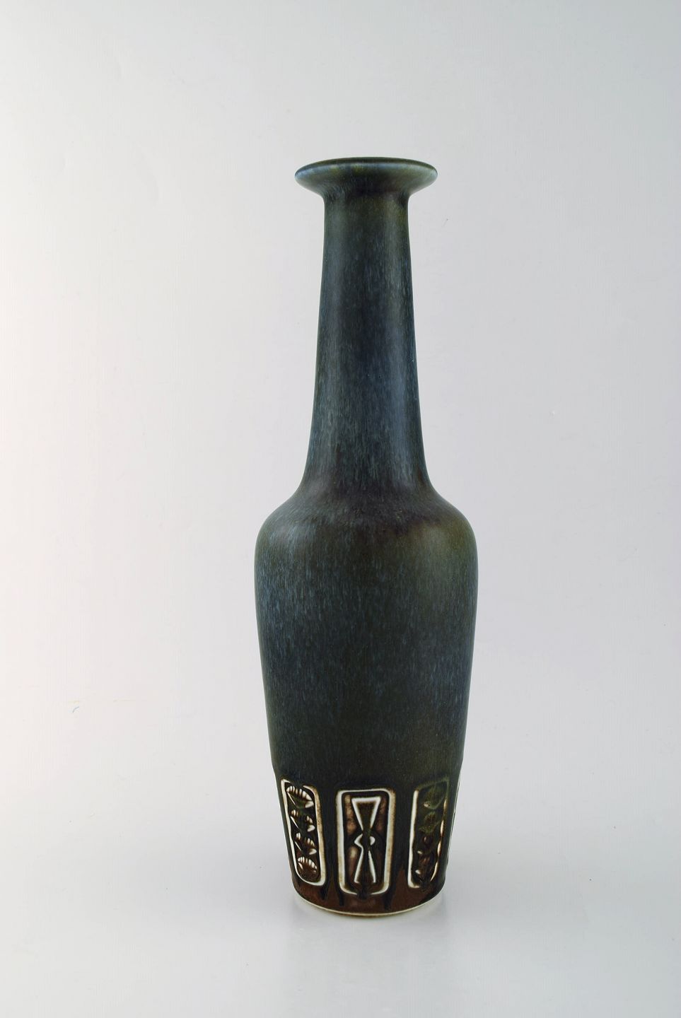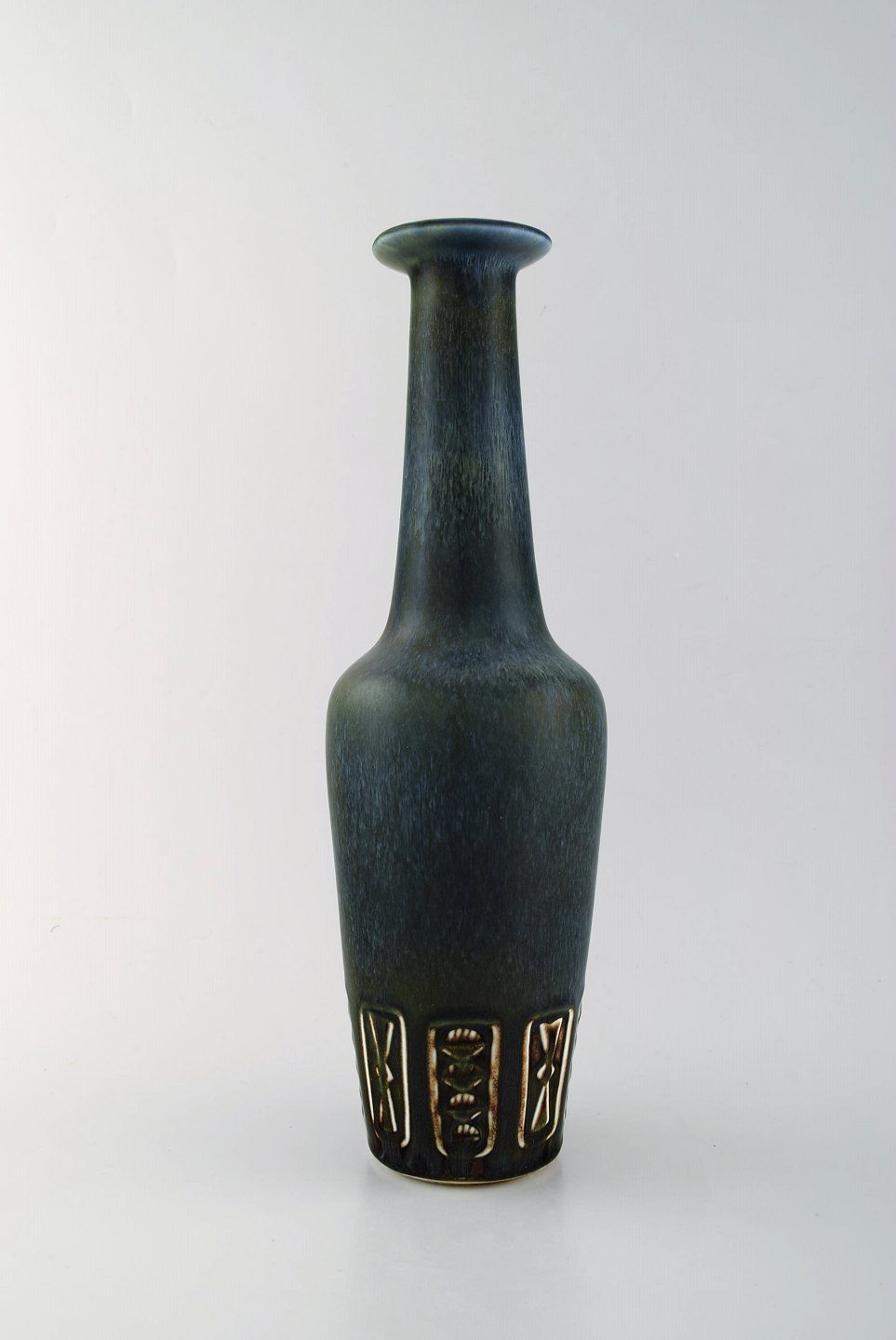 Stor Rörstrand/Rørstrand stentøjsvase af Gunnar Nylund. 1960'erne. Måler: 34 x 11 cm. I perfekt stand. Flot glasur i mørkeblå nuancer. 2. sortering. Stemplet.