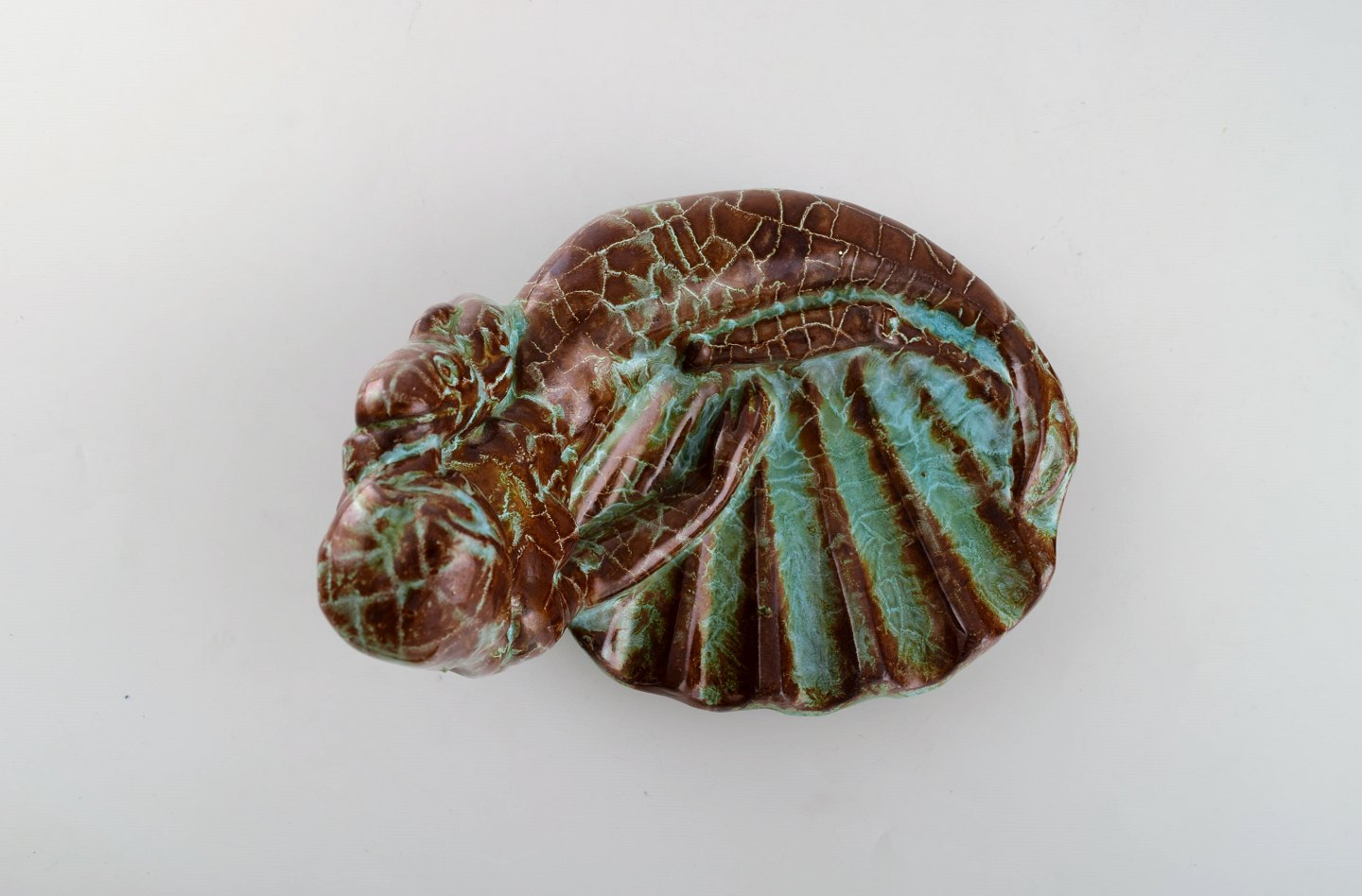 Skulptur / skål i form af liggende havfrue med fisk. Smuk glasur i rødbrune og turkise toner. 1940'erne.