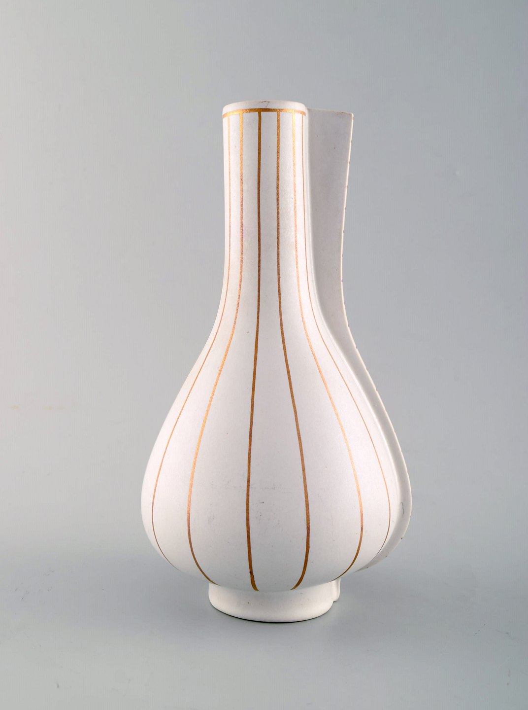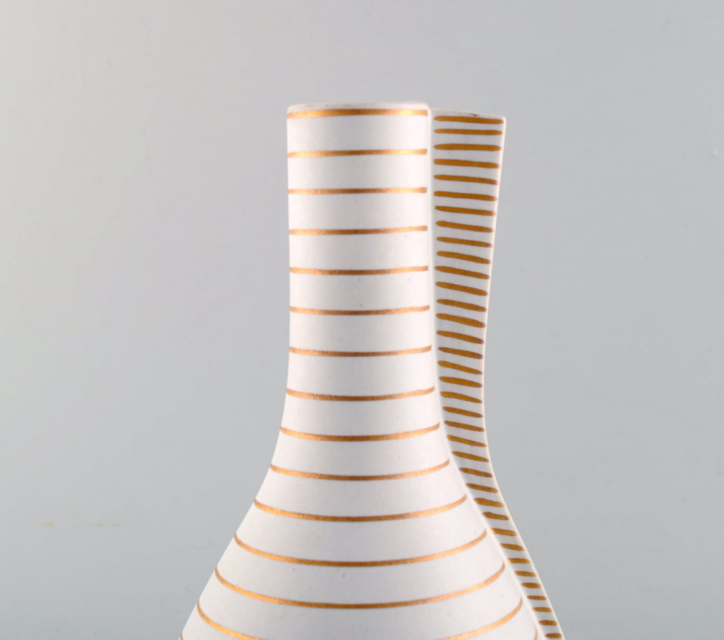 Wilhelm Kåge for Gustavsberg Studio Hand. Stor "Guldsurrea" keramik dobbeltvase i mat hvid carrara-glasur med horisontale og vertikale guldstriber. Ikonisk og surrealistisk design. Surrea serien blev designet i 1936.