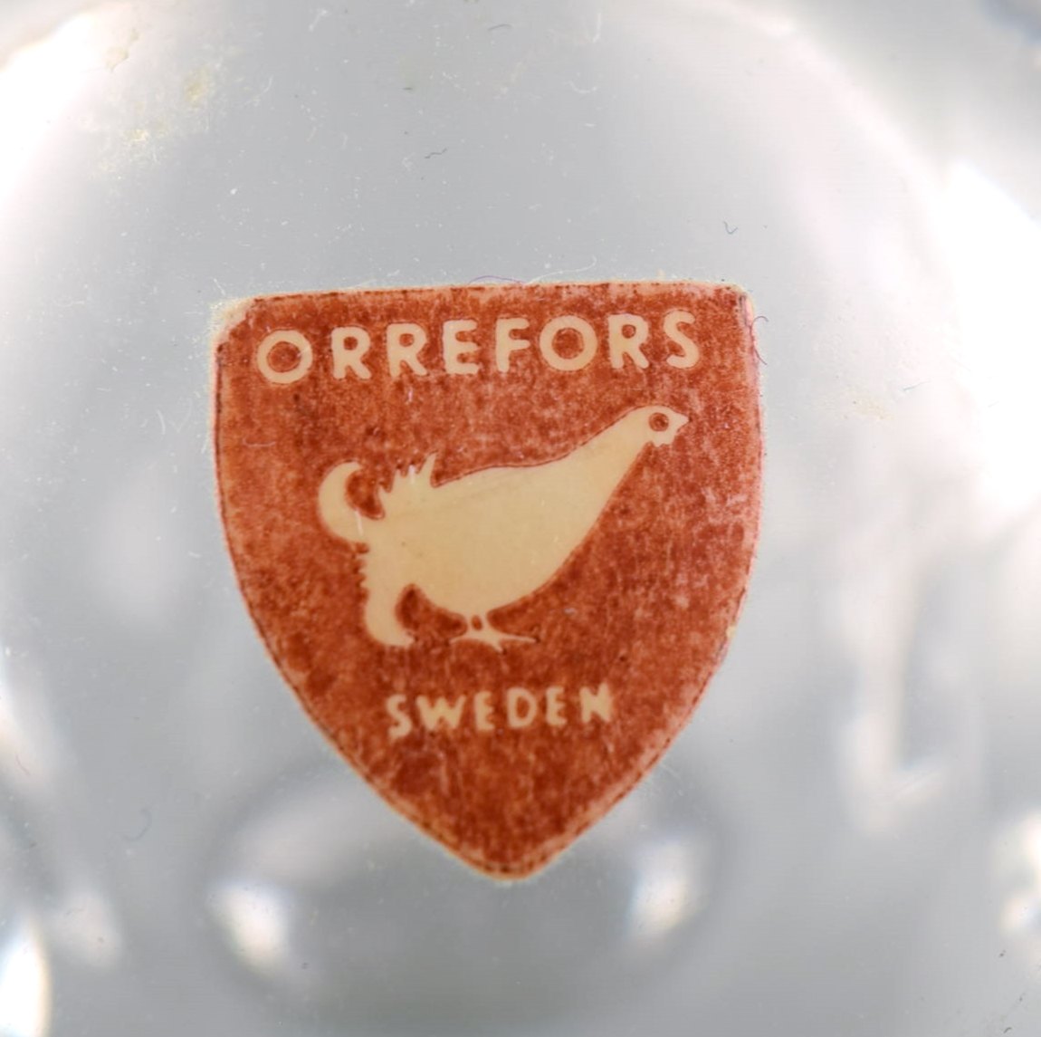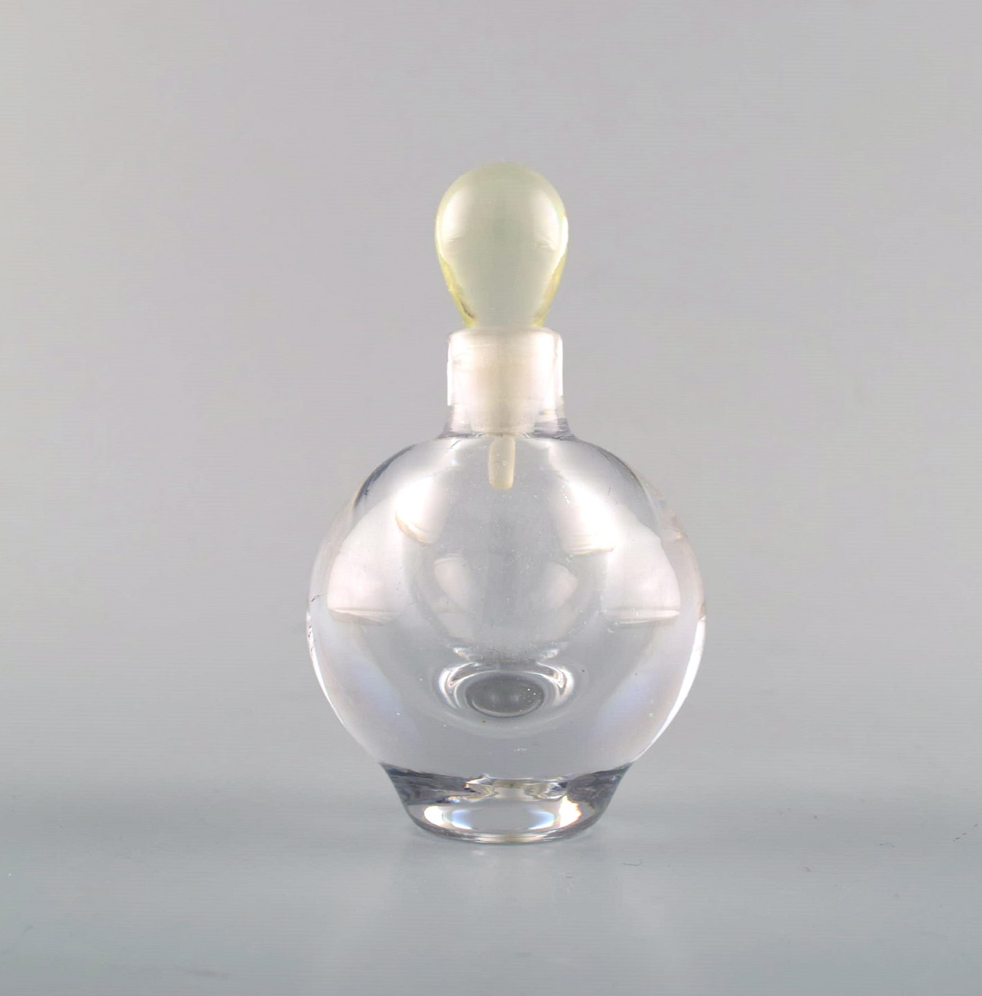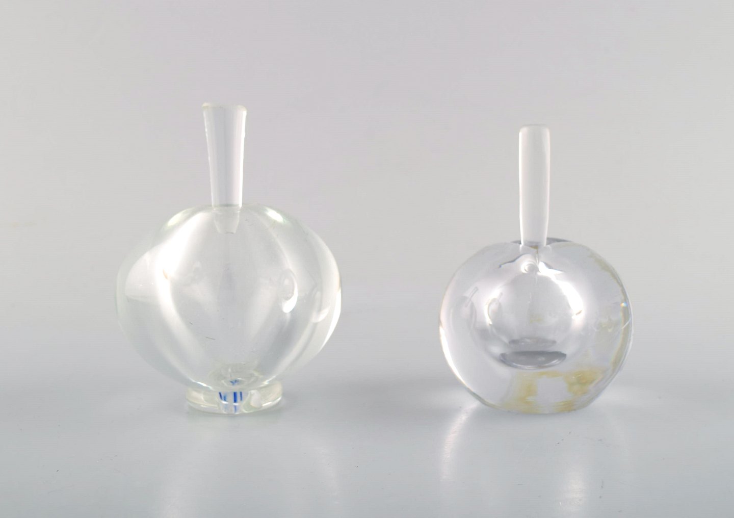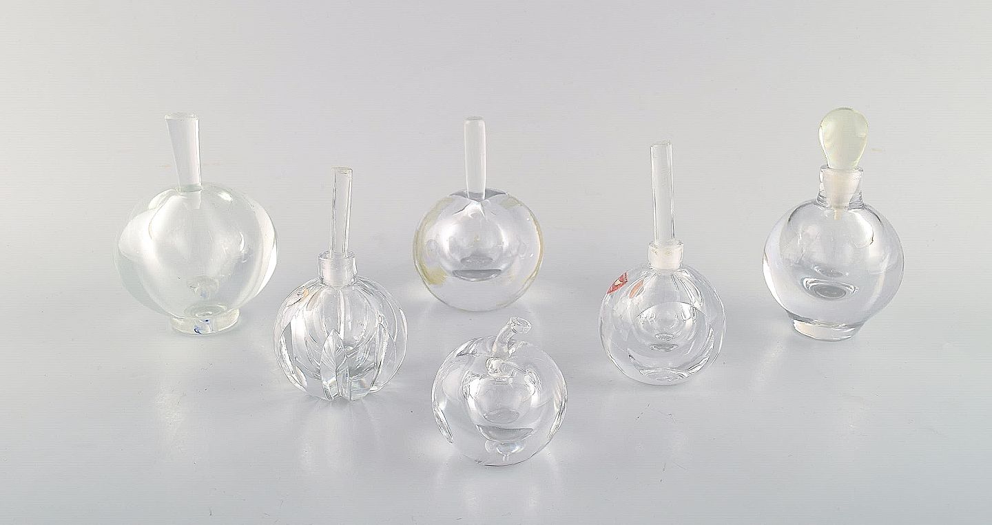 Edward Hald for Orrefors. A collection of six mouth blown flacons in clear art glass. Designed in the 1940's. In very good condition. Sticker. Largest gauge: 11 x 8.5 cm.
