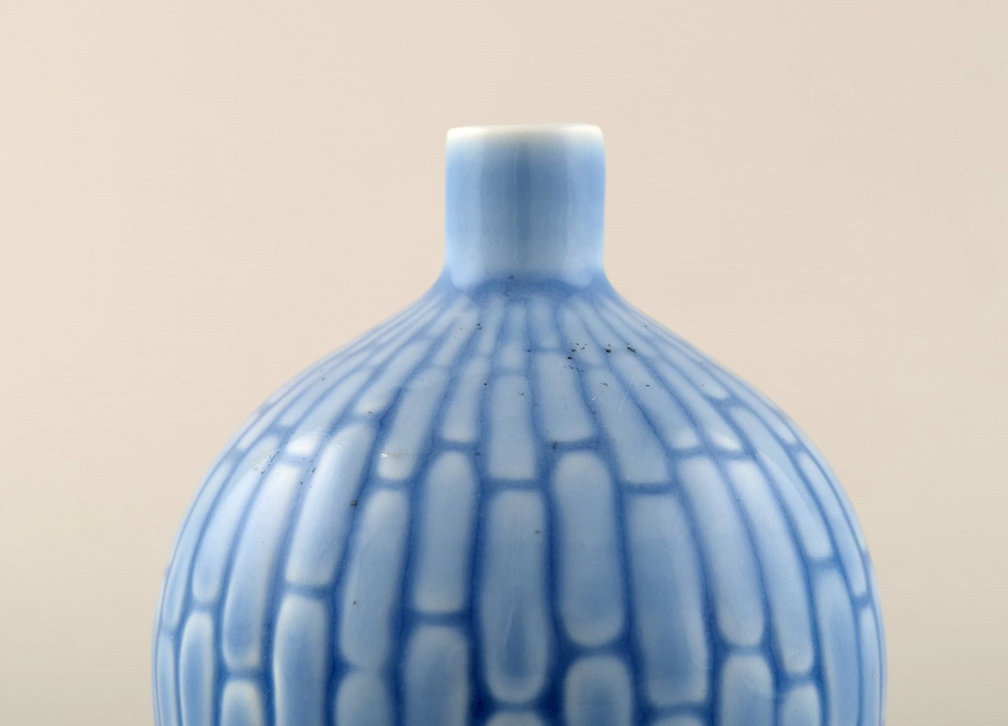 Gull Weinberg for Rørstrand. Sjælden art deco keramikvase i lyseblå toner med buttet korpus. Dateret 1935-1938.