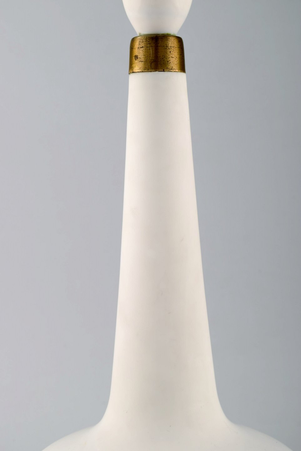 Holmegaard bordlampe i hvidt kunstglas med messing montering. Moderne design, 1960'erne.