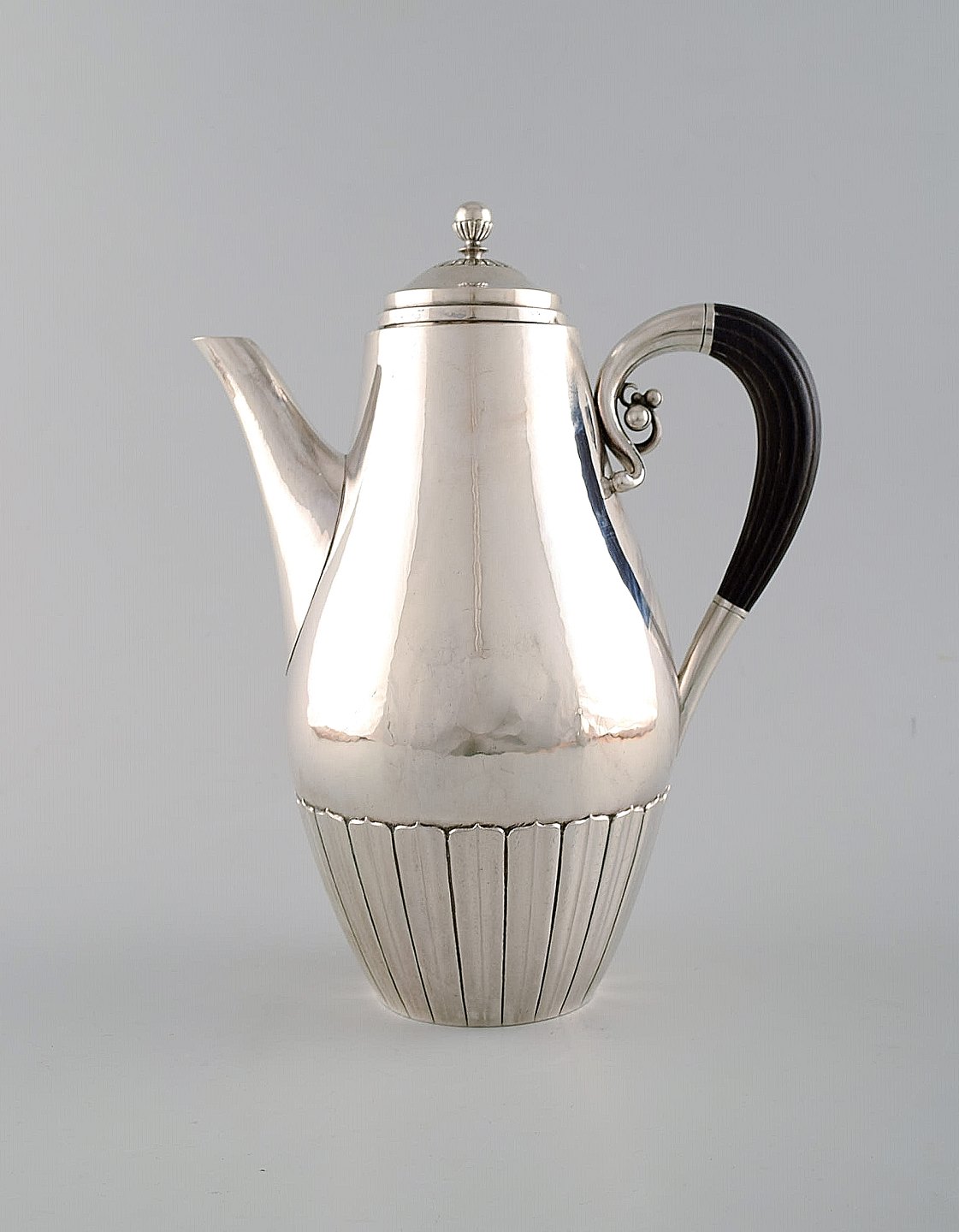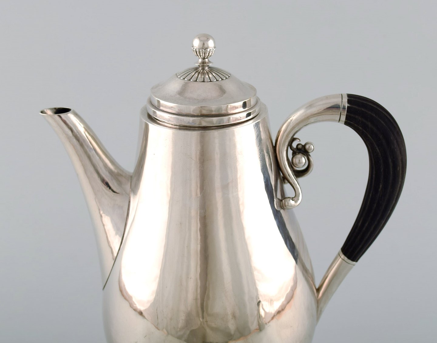 Johan Rohde for Georg Jensen. "Kosmos" kaffesæt i sterlingsølv med hanke i ibenholt. Dessin 45A og 45D. Bestående af kaffekande, flødekande og sukkerskål.