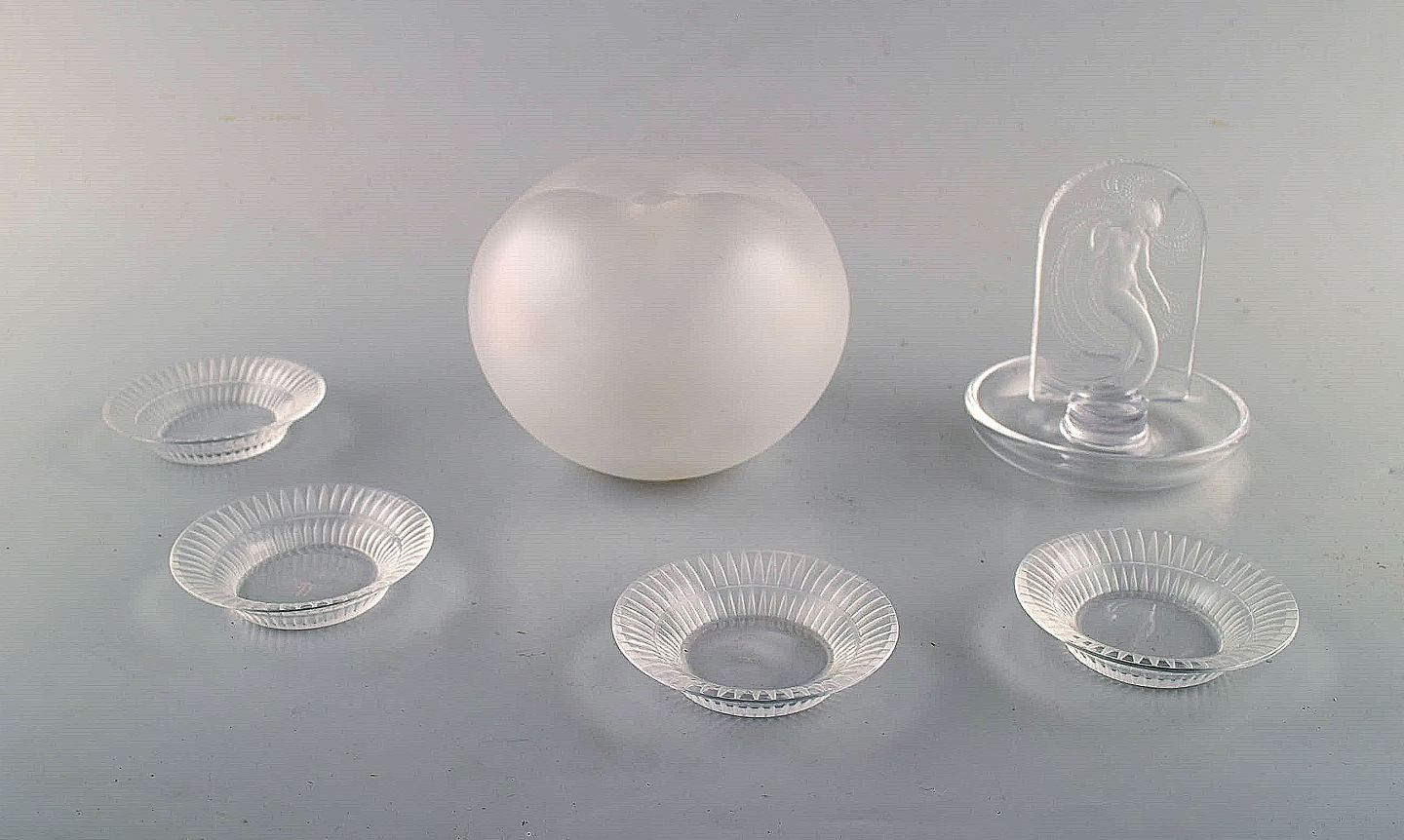 Lalique. Samling bestående af en vase, smykkeskål og fire kaviarskåle. 1960'erne. I flot stand. Indridset signatur. Vasen måler: 13 x 9,5 cm.