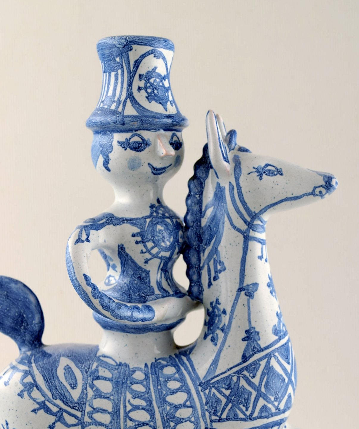 Bjørn Wiinblad keramikfigur fra det blå hus. Figur / lysestage rytter til hest med plads til et lys. Dekorationsnummer L4. Denne er fra 1974. Måler: 31 x 25 cm. Perfekt stand.