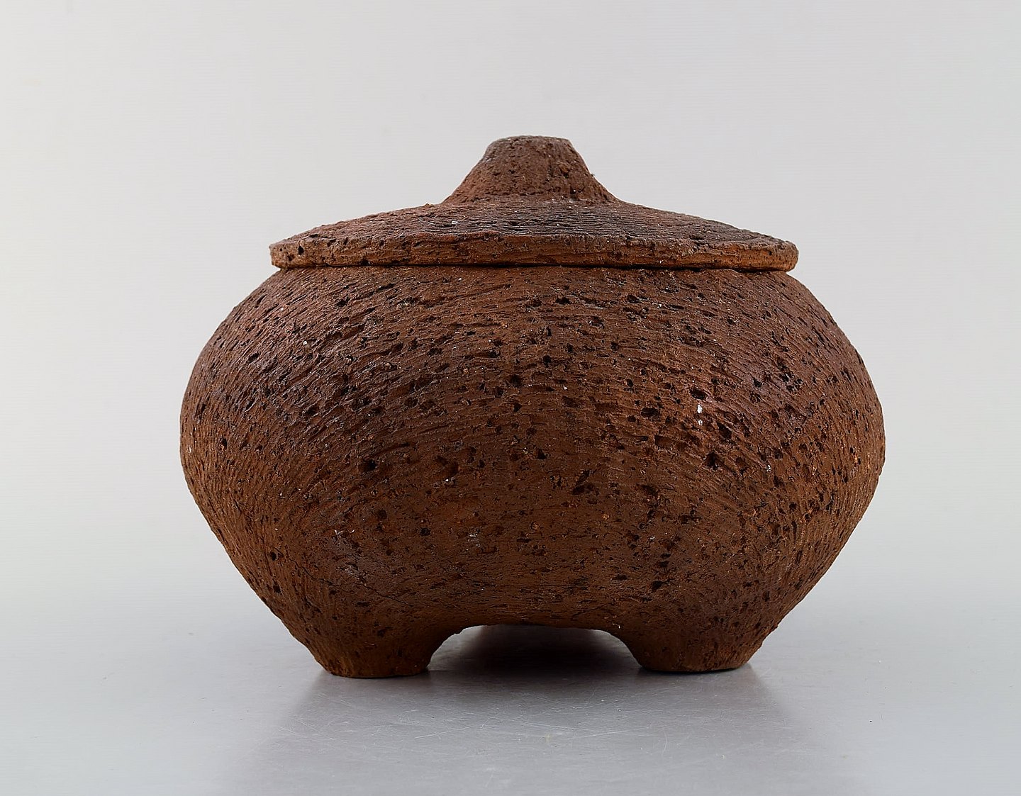 Gutte Eriksen: f. Rødby 1918, d. 2008. Stor unika lågkrukke på fødder i stentøj. Rakubrændt teknik. 1960'erne. Måler : 20 x 13,5 cm. Signeret. I flot stand.