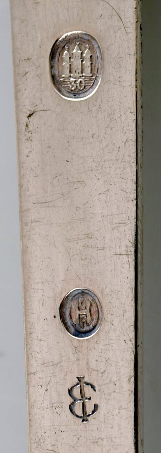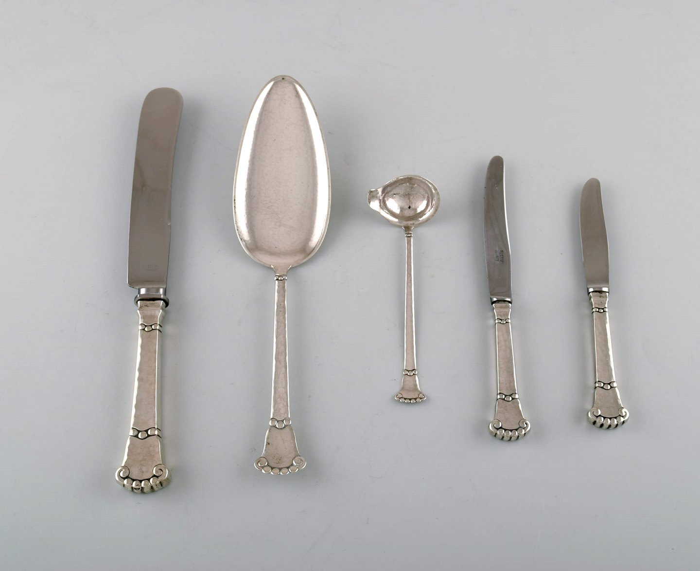 S. Chr. Fogh, 1912-1973. Dansk sølvsmed. "Kugle" bestik i hammerslået sølv. Komplet middagsservice til otte personer. 1930'erne.