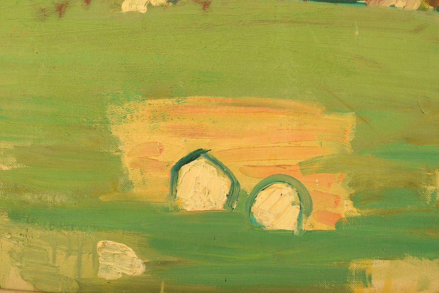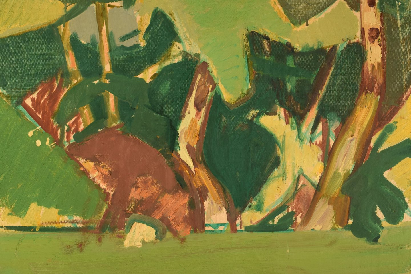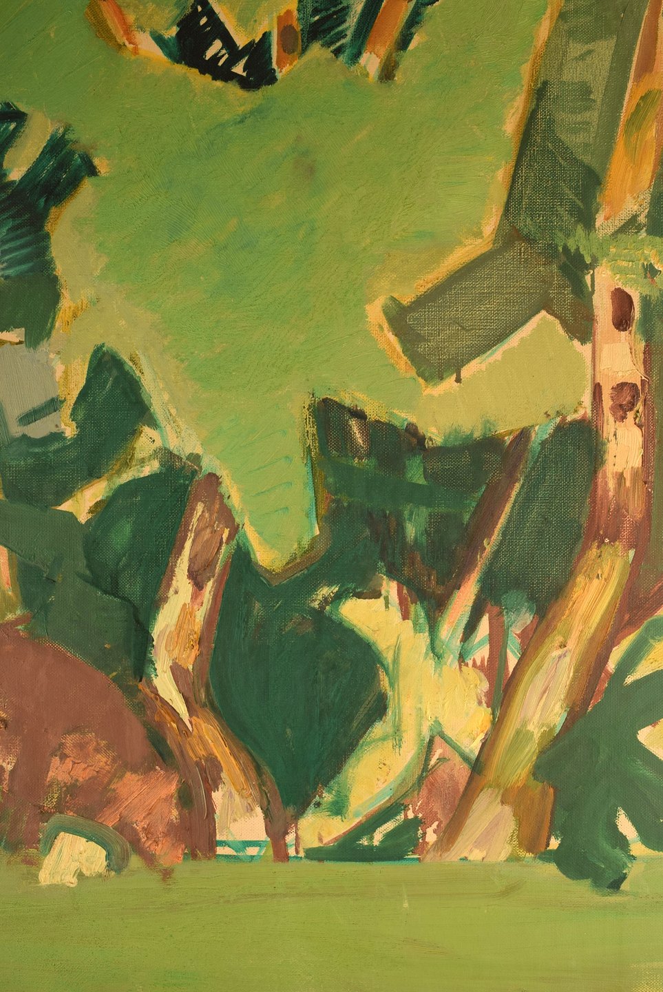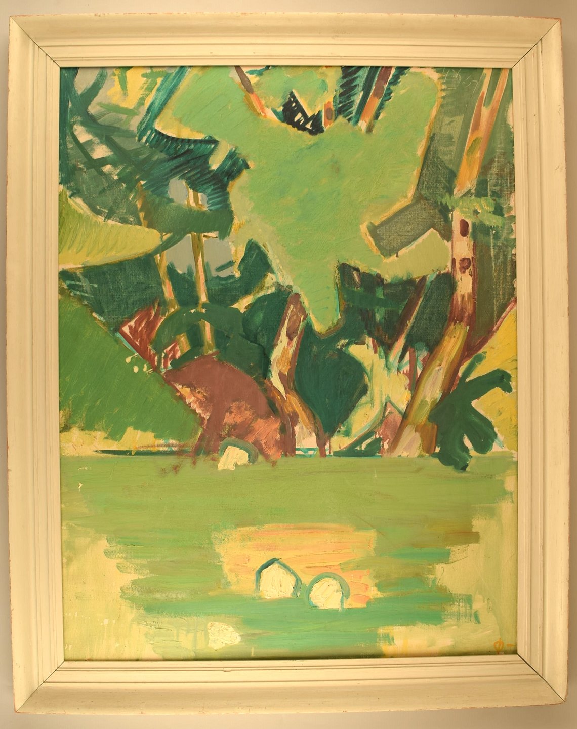 Hans Øllgaard (f. 1911, d. 1969). Abstrakt modernistisk landskab. Olie på lærred. 1950/60'erne. Signeret. I flot stand. Lærredet måler: 85 x 66 cm Rammen måler: 7,5 cm.