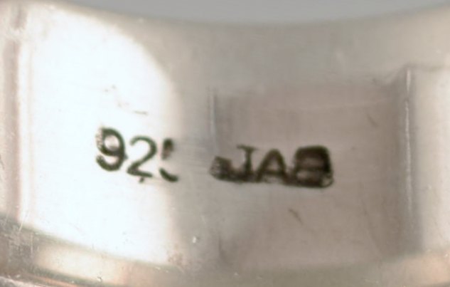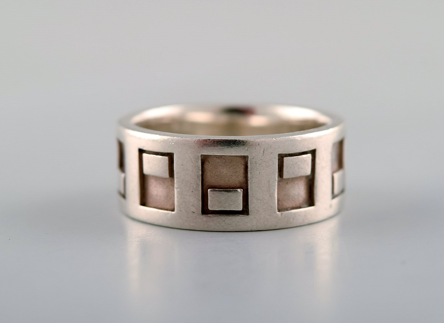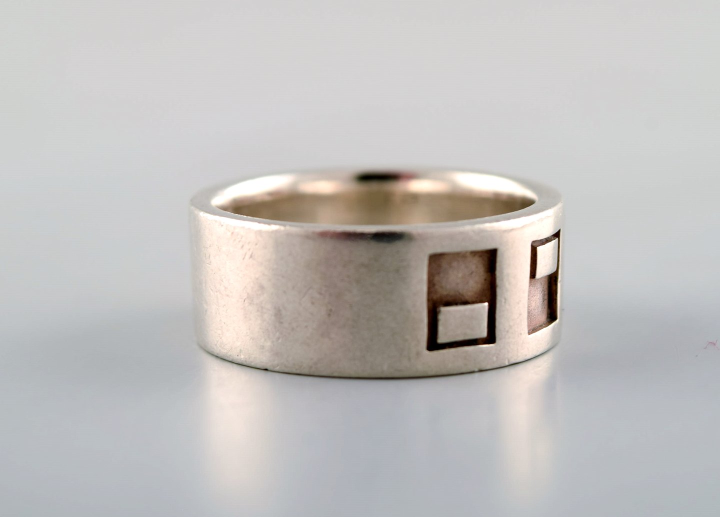 Svensk modernistisk ring i sterlingsølv. 1960'erne. I flot stand. Stemplet. Måler: 21 mm. I de fleste tilfælde kan vi mod et gebyr (kr. 300) pr ring, få ændret størrelsen.