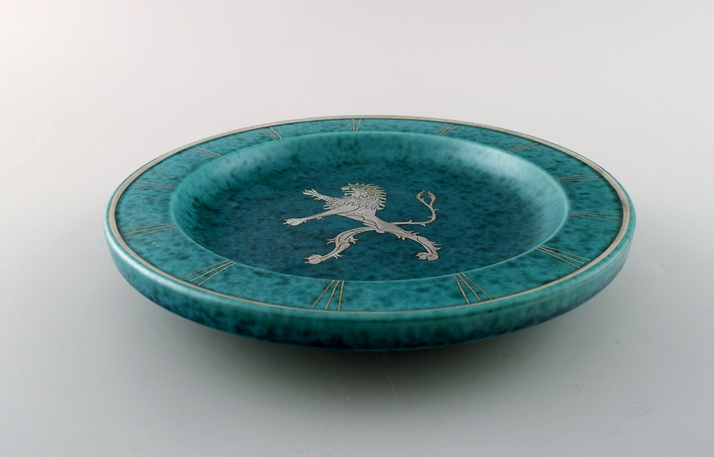 Wilhelm Kåge, Gustavsberg, art deco Argenta fad på fødder i keramik dekoreret med løve i sølvindlæg. Modelnummer: A24. Sverige 1940´erne. Måler 23 x 4 cm. Stemplet Gustavsberg, Kåge. I perfekt stand.