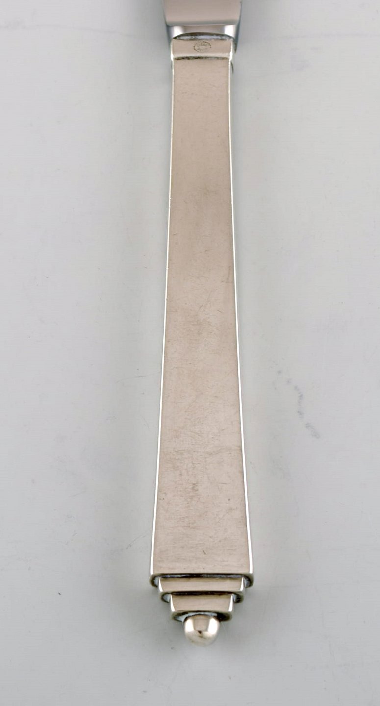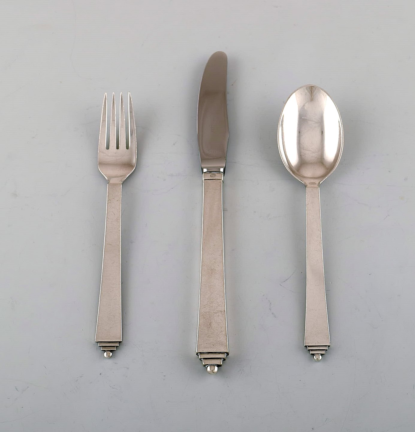 Georg Jensen Pyramide frokostservice i sterlingsølv til otte personer. Bestående af otte middagsgafler, otte middagsknive og otte spiseskeer.