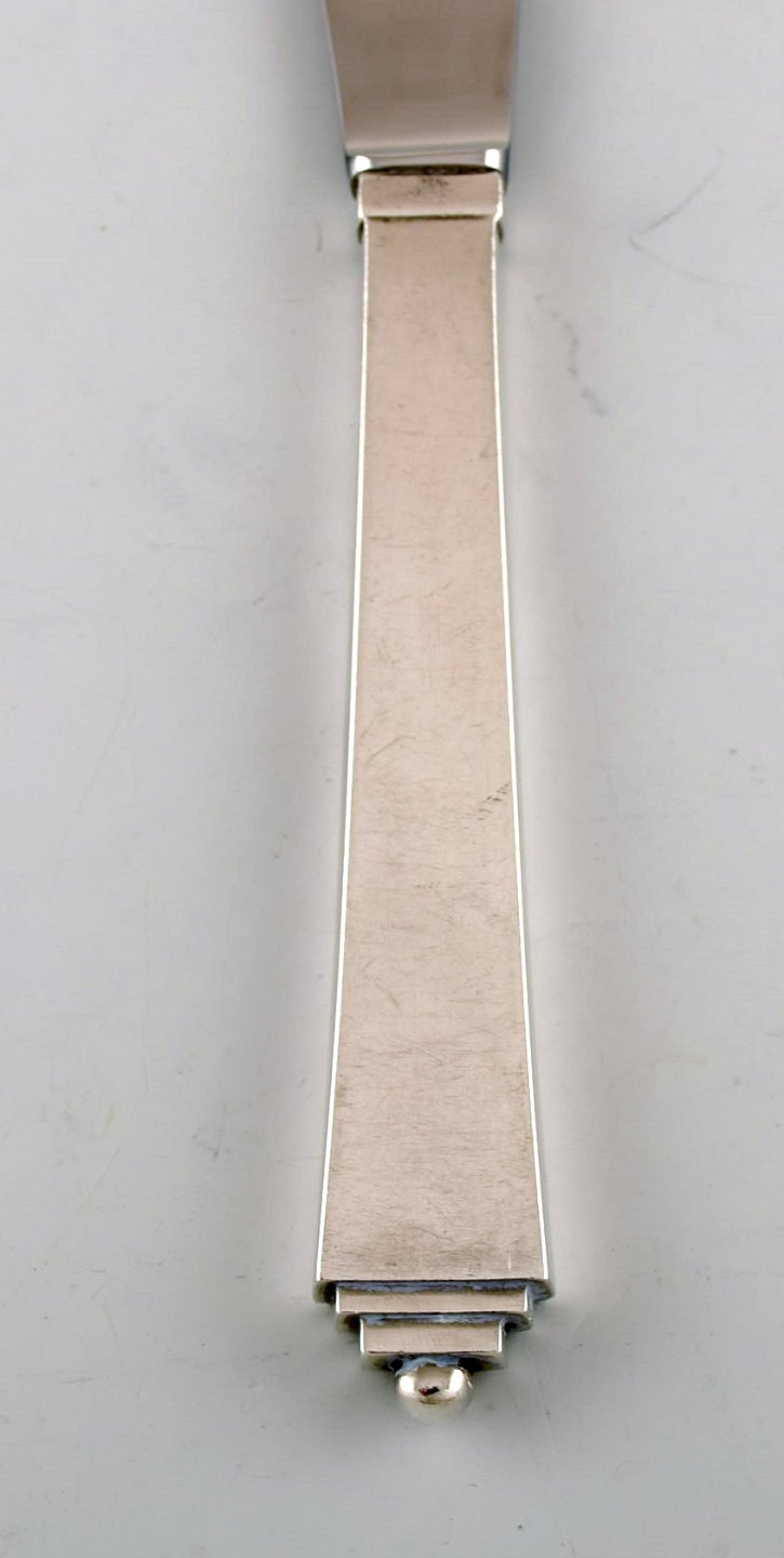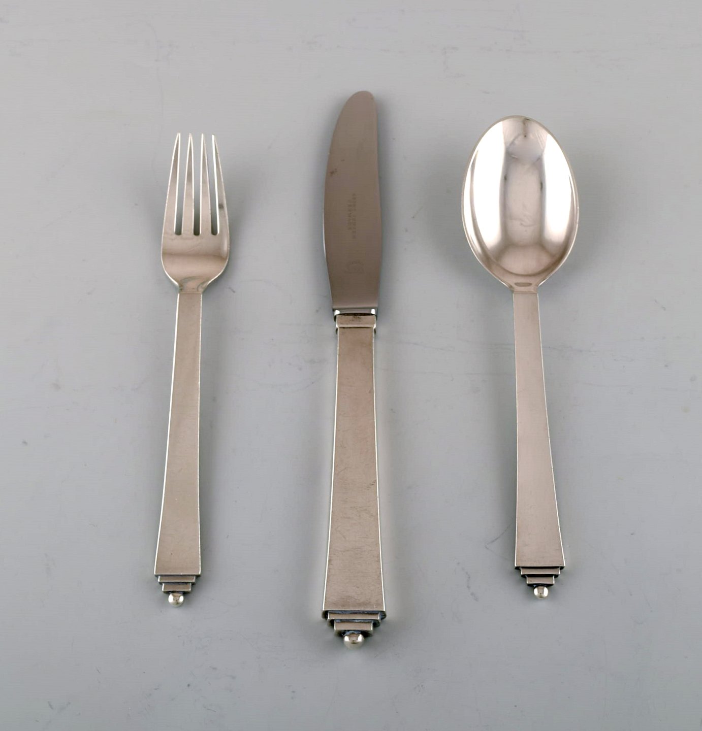 Georg Jensen Pyramide middagsservice i sterlingsølv til seks personer. Bestående af seks middagsgafler, seks middagsknive og seks spiseskeer.