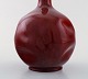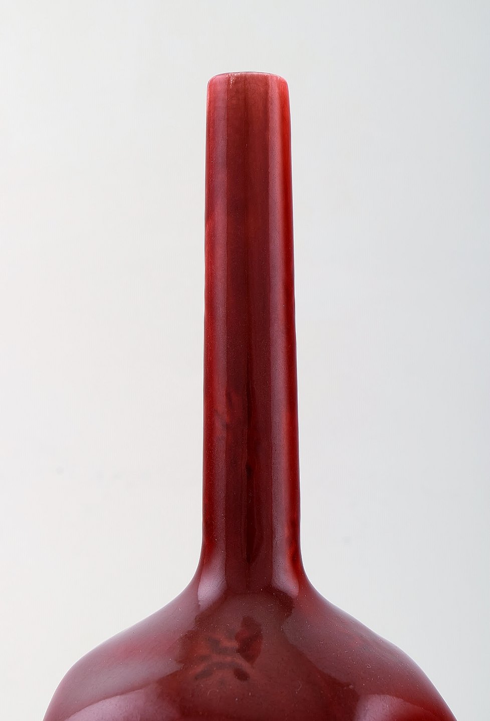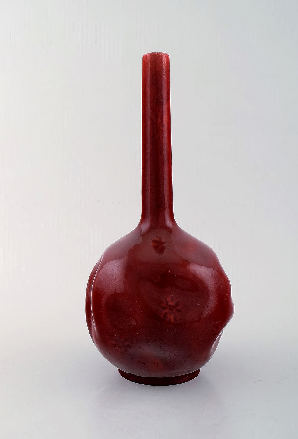 Rörstrand. Tidlig smalhalset vase i glaseret fajance. Smuk dyb rød glasur. Ca. 1900.