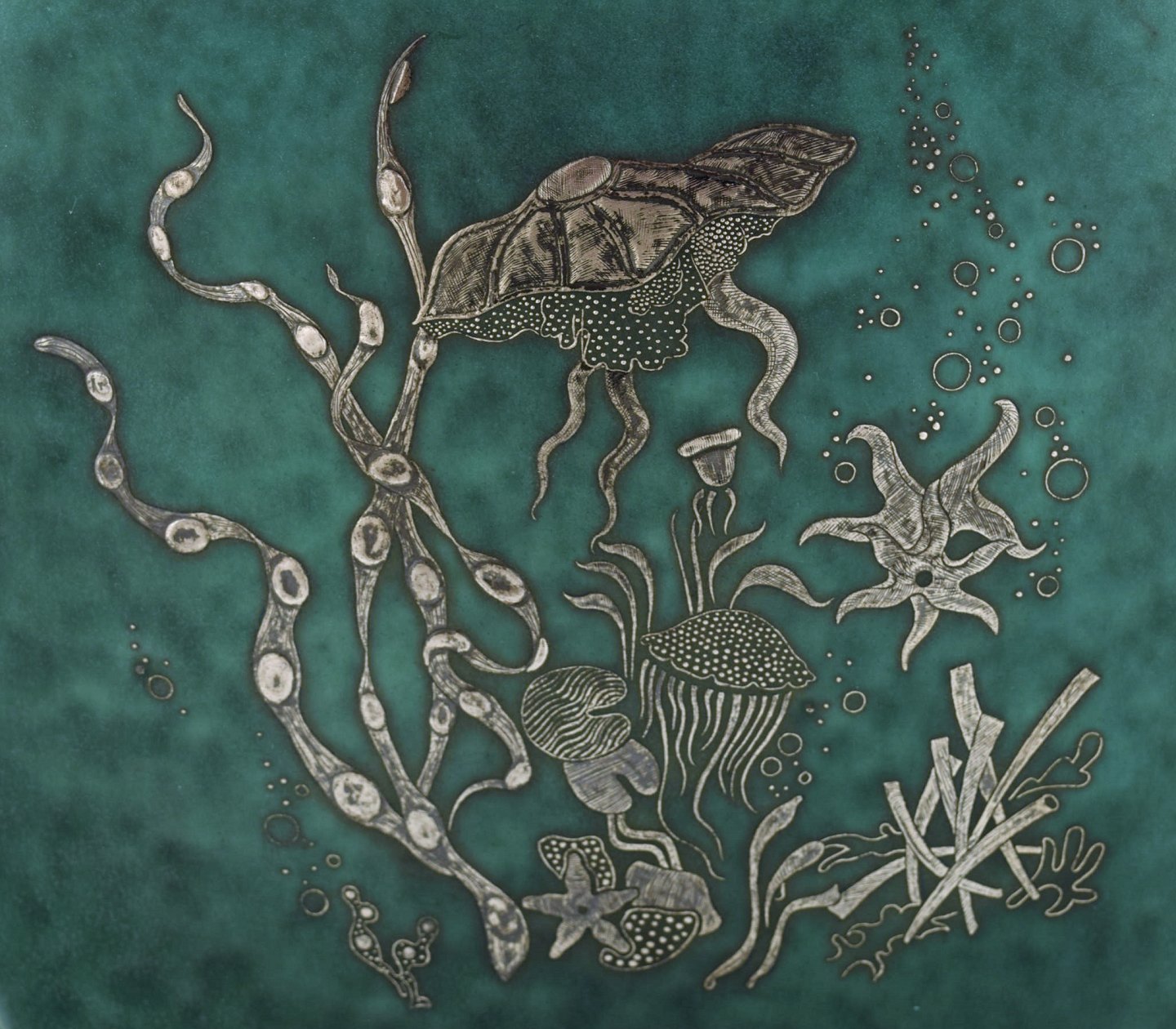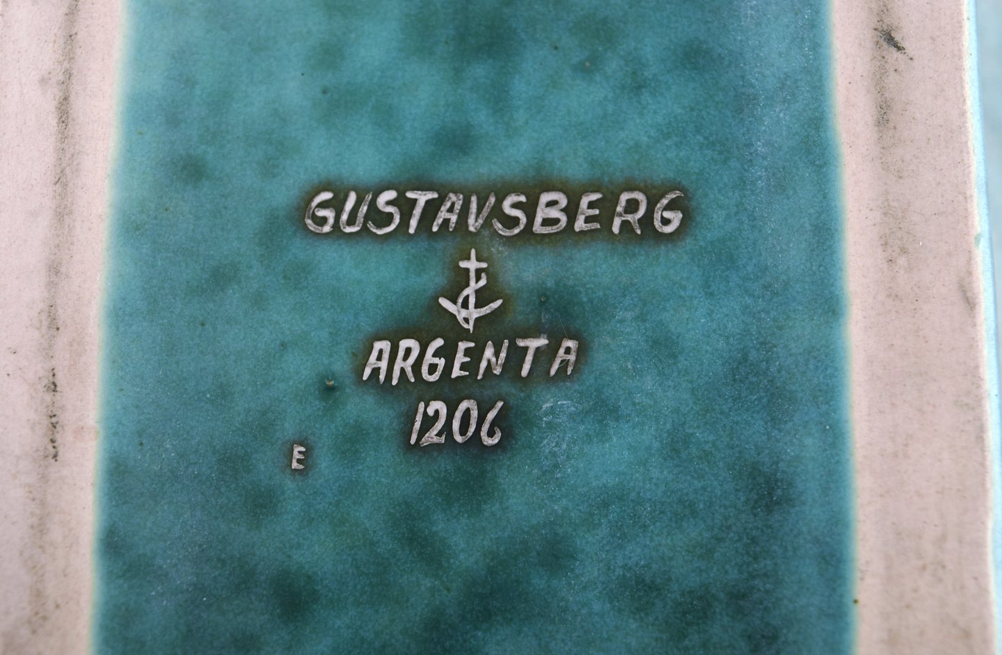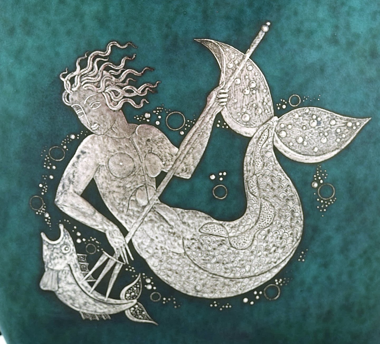 Wilhelm Kåge for Gustavsberg. Stor sjælden argenta art deco lågkrukke i glaseret keramik dekoreret med havfrue og gobler i sølvindlæg.