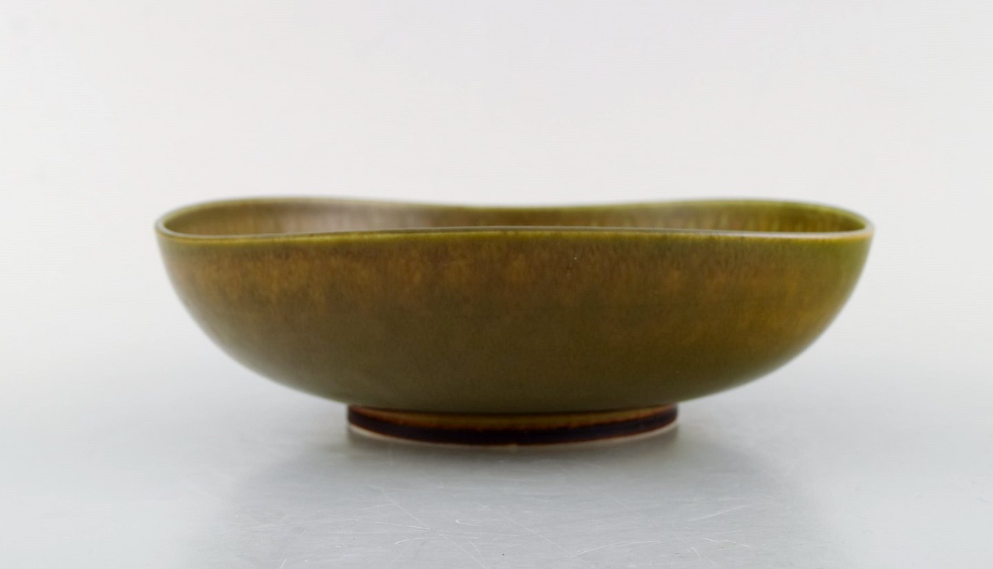 Berndt Friberg (1899-1981) for Gustavsberg Studiohand. Skål i glaseret stentøj. Smuk glasur i olivengrønne nuancer. 1950/60'erne.
