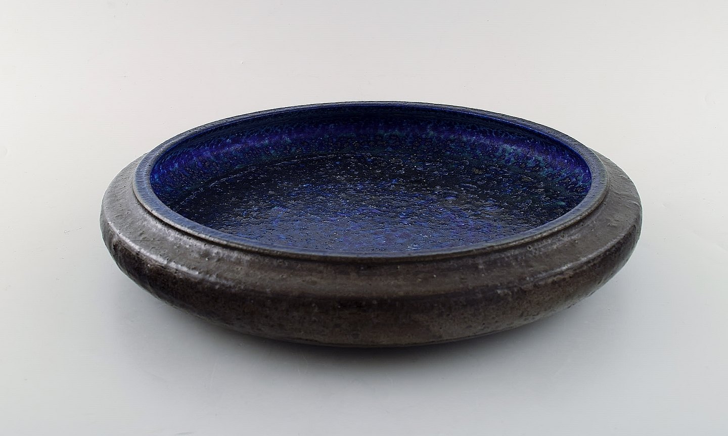 Liisa Hallamaa Larsen for Arabia. Stor unika skål i glaseret stentøj. Smuk glasur i brune og blå nuancer. Finsk design, 1960'erne. Måler: 32 x 5,8 cm. I flot stand. Signeret.