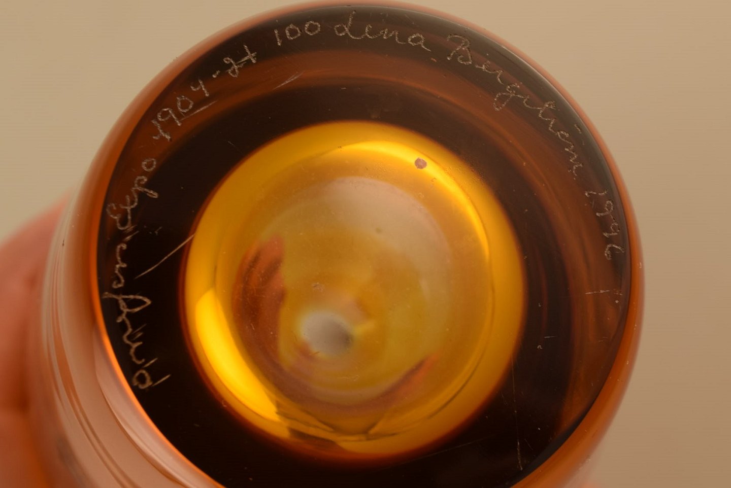 Lena Bergström for Orrefors. Vase i metallisk ravfarvet mundblæst kunstglas. Dateret 1996.