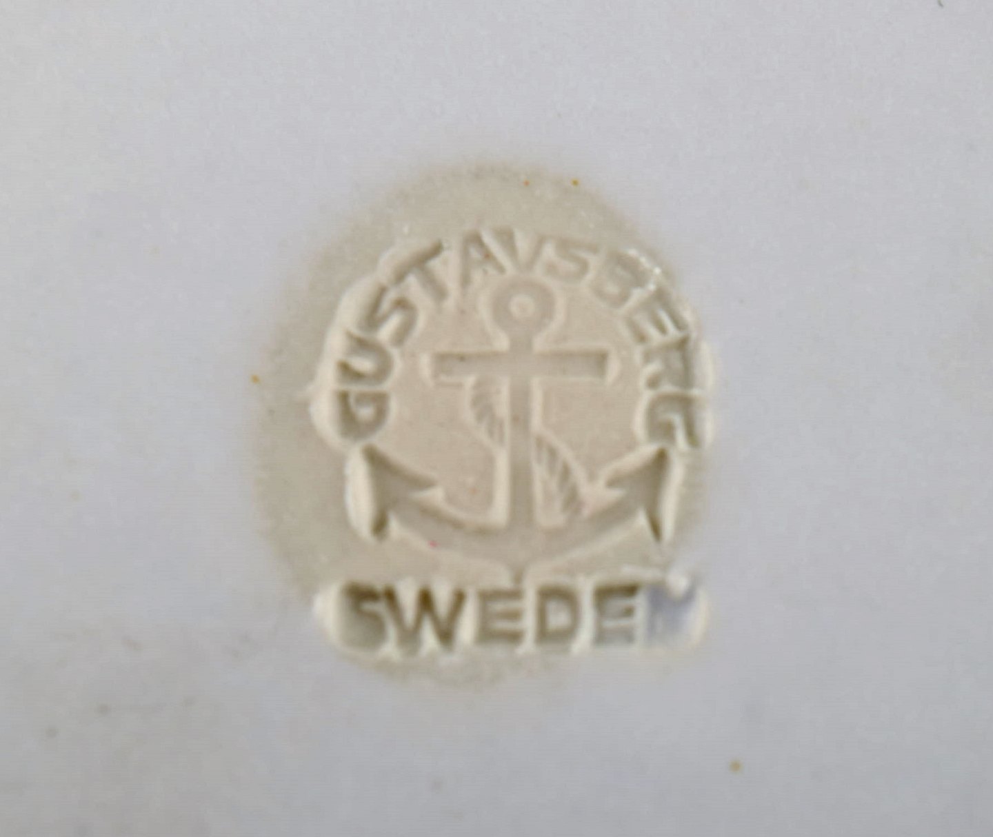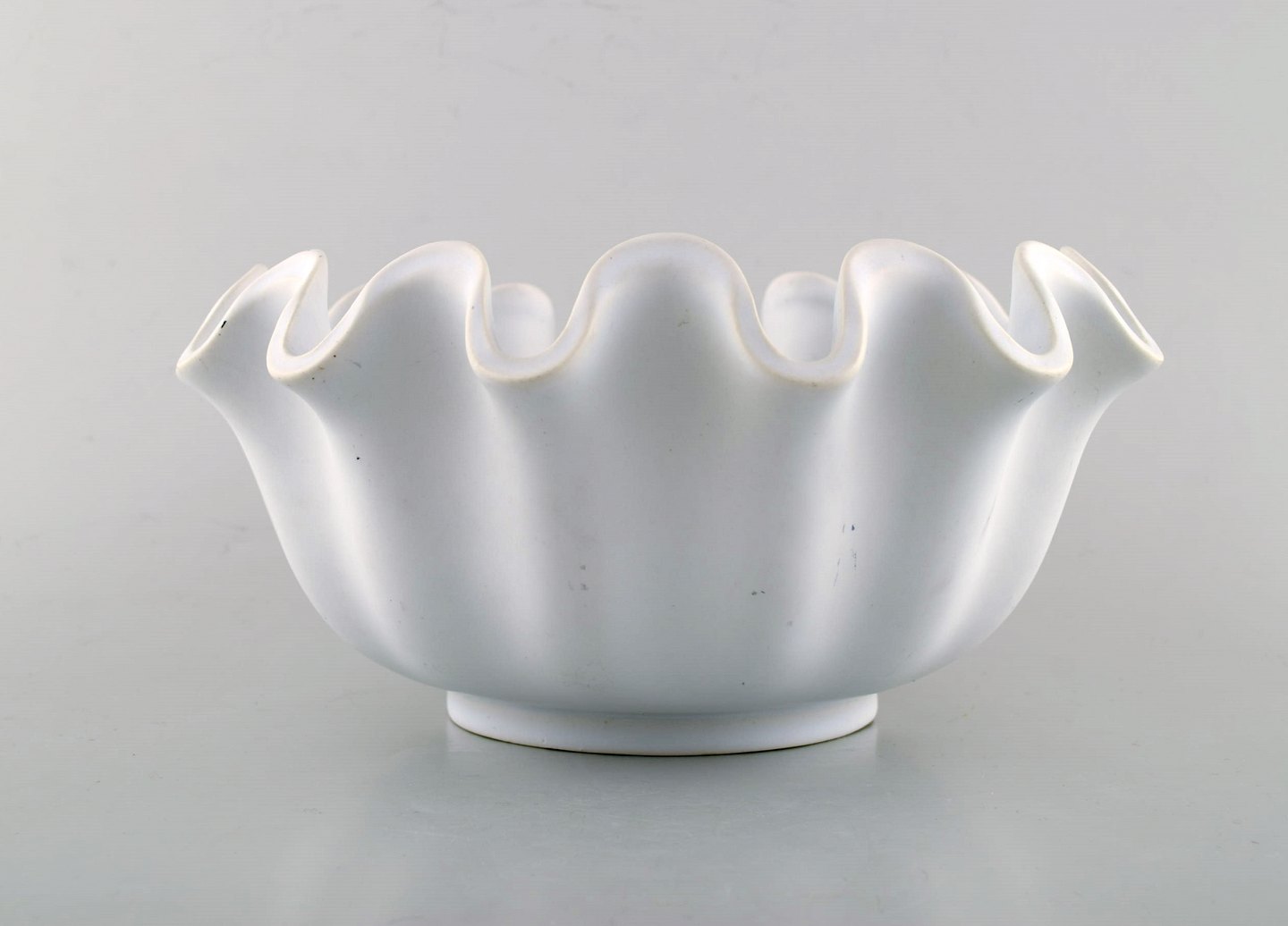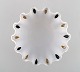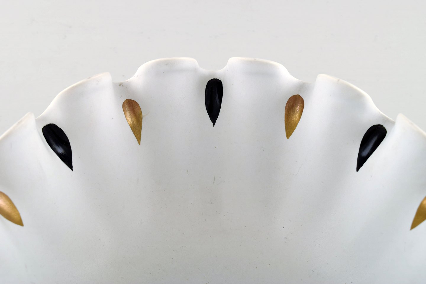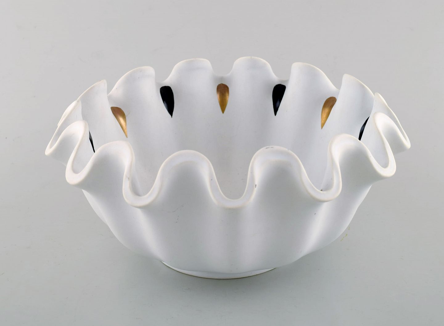 Wilhelm Kåge for Gustavsberg. Stor svungen skål i glaseret keramik med flæsekant. Håndmalet sort og guld. Midt 1900-tallet.