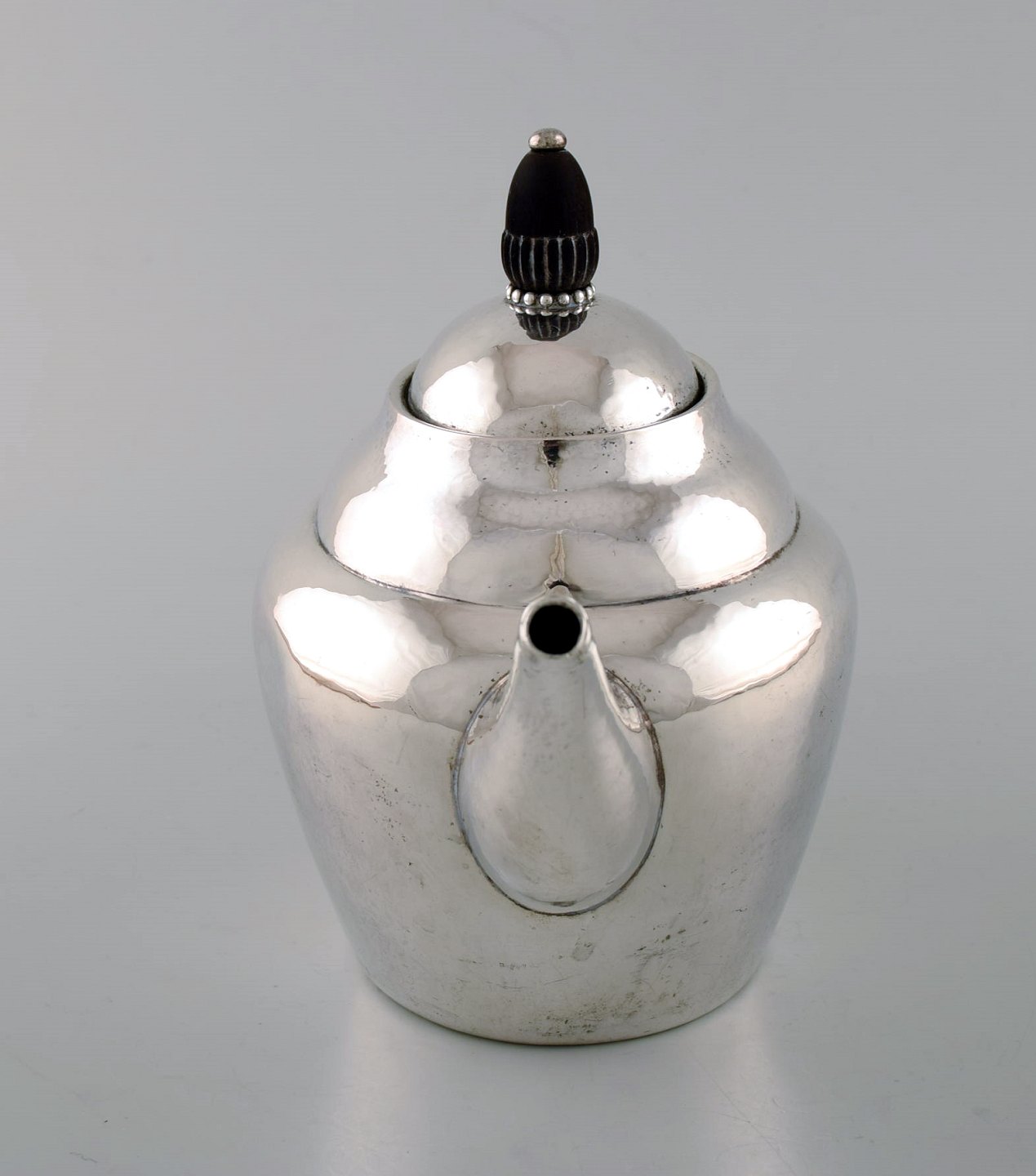 Tidlig og sjælden Georg Jensen tekande i hammerslået sølv med hank i ibenholt. Design nummer 28. Dateret 1915-30. Måler: 23,5 x 16 cm. Stemplet. I flot stand.