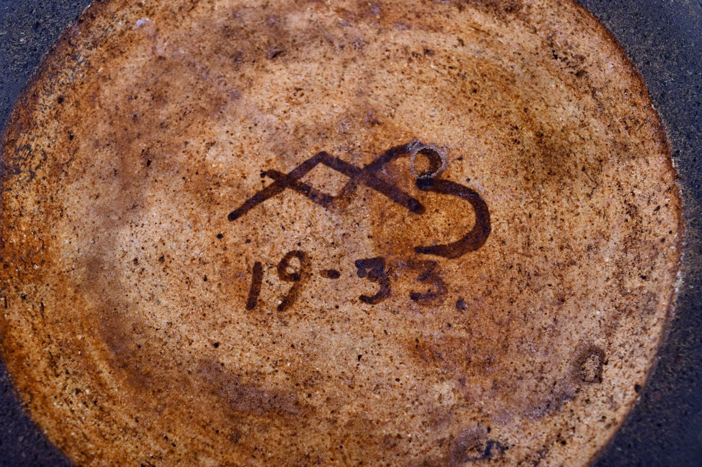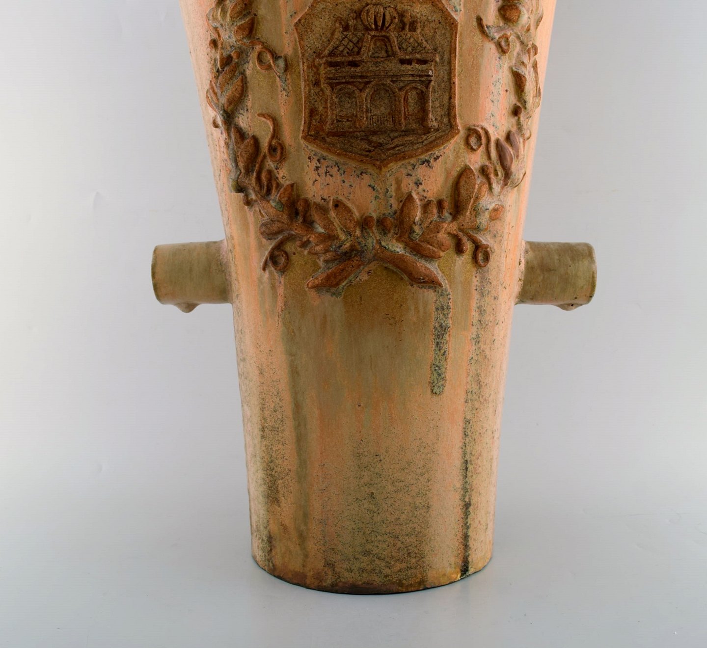 Kolossal Arne Bang unika vase i glaseret keramik med bomærke fra apotek i Aalborg. Dateret 1933. Dekoreret med æskulapsnog med skål af Hygieia som et symbol på apotek.