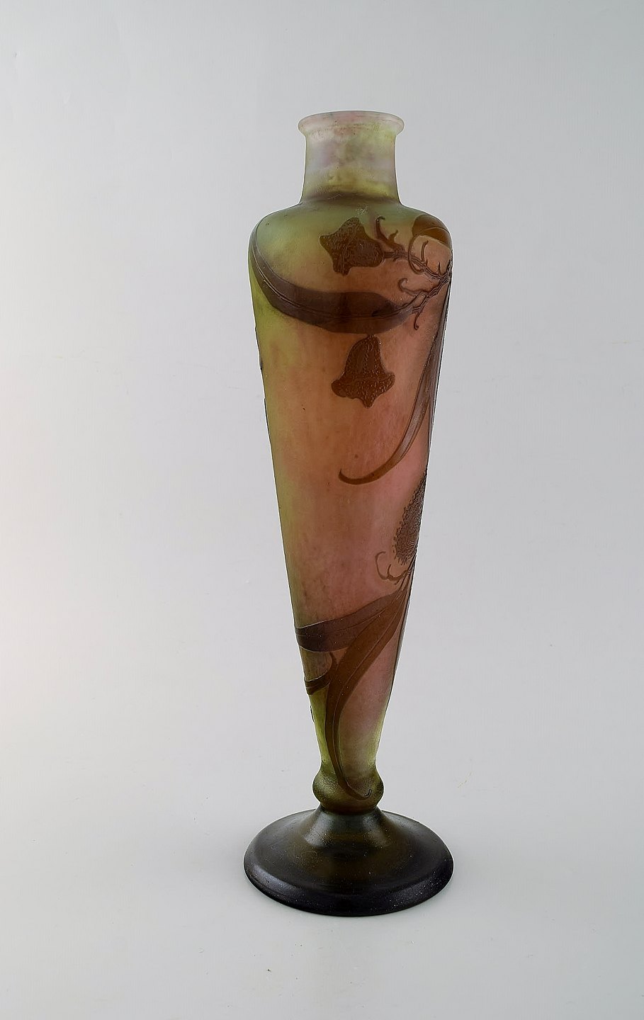Emile Gallé vase i matteret kunstglas med overfang af brunt kunstglas udskåret med motiver i form af blomster og blade. Ca. 1910.
