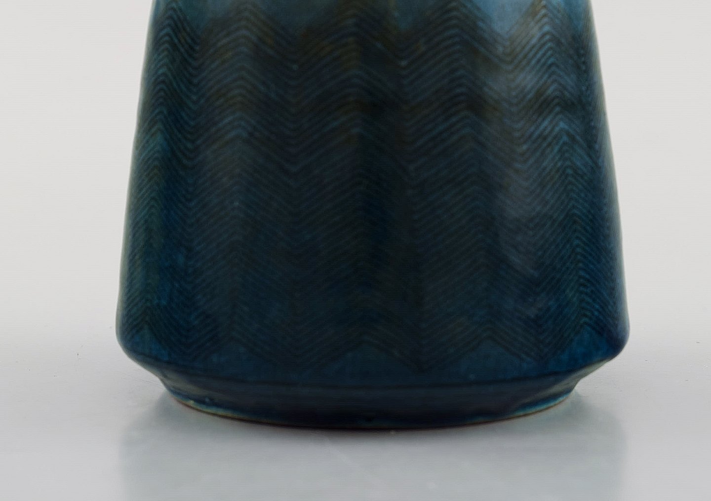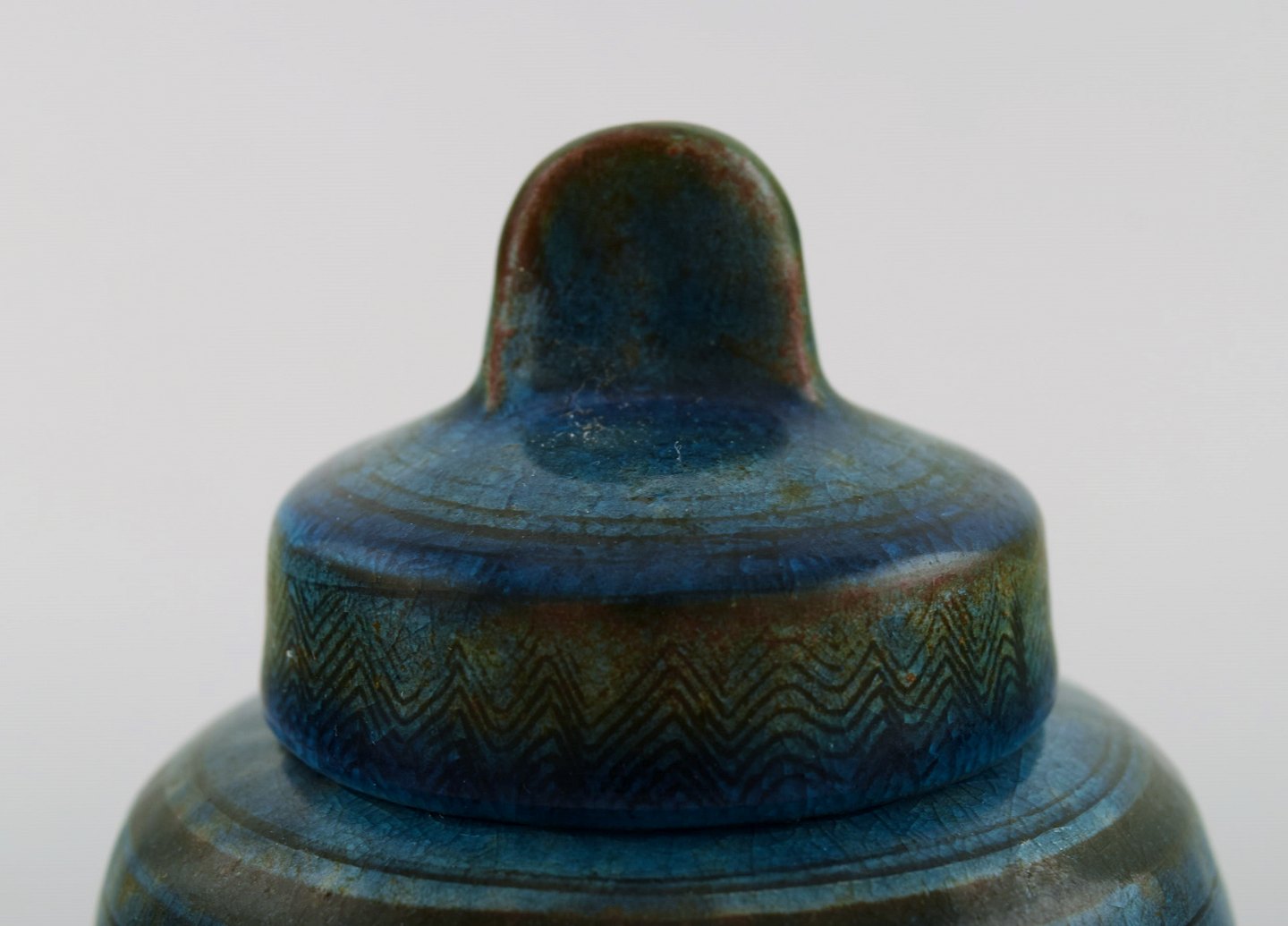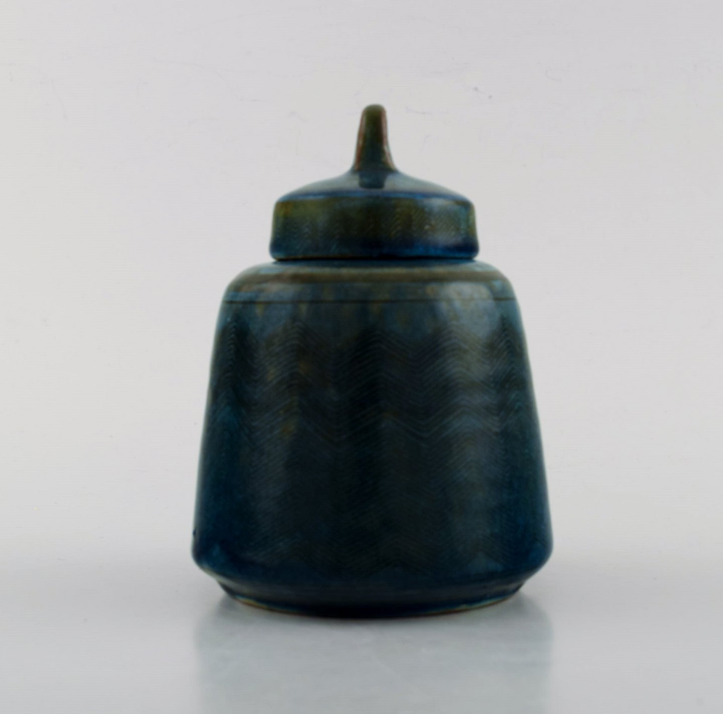 Nils Kähler for Kähler, HAK. Sjælden glaseret lågkrukke med sgrafitto i smuk turkis glasur. 1960'erne. Måler: 12,5 x 9,5 cm. I flot stand. Stemplet.