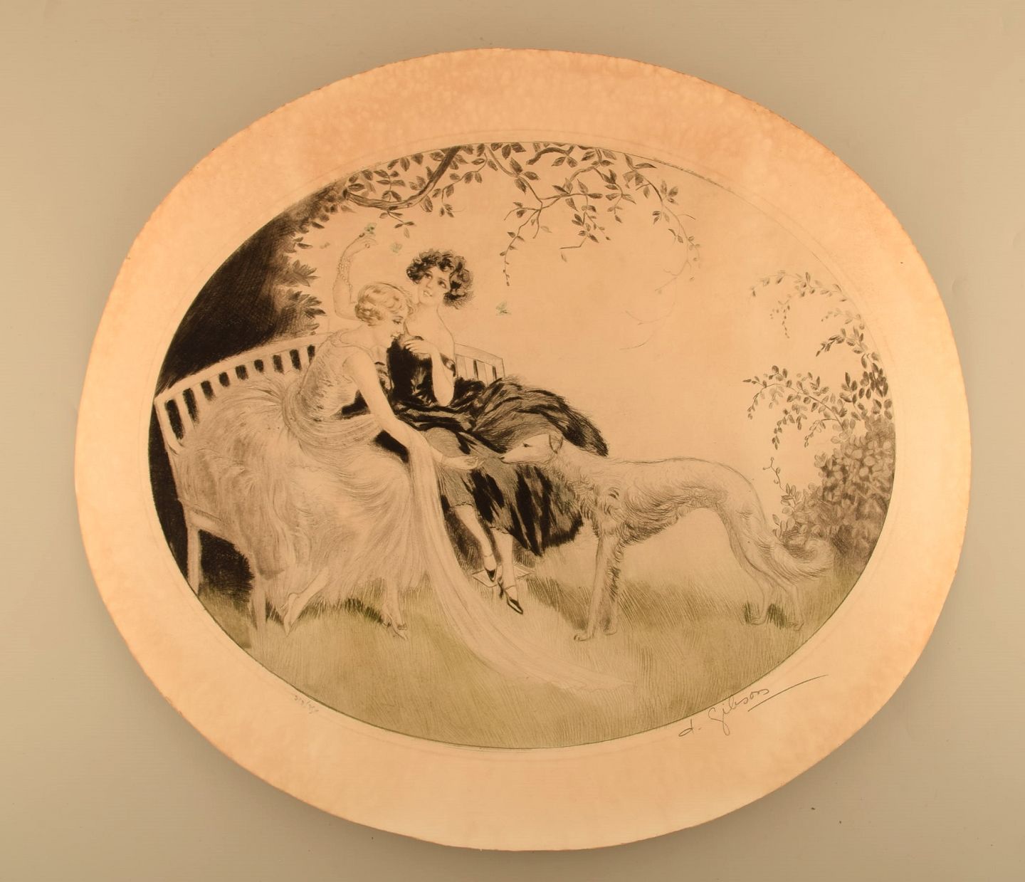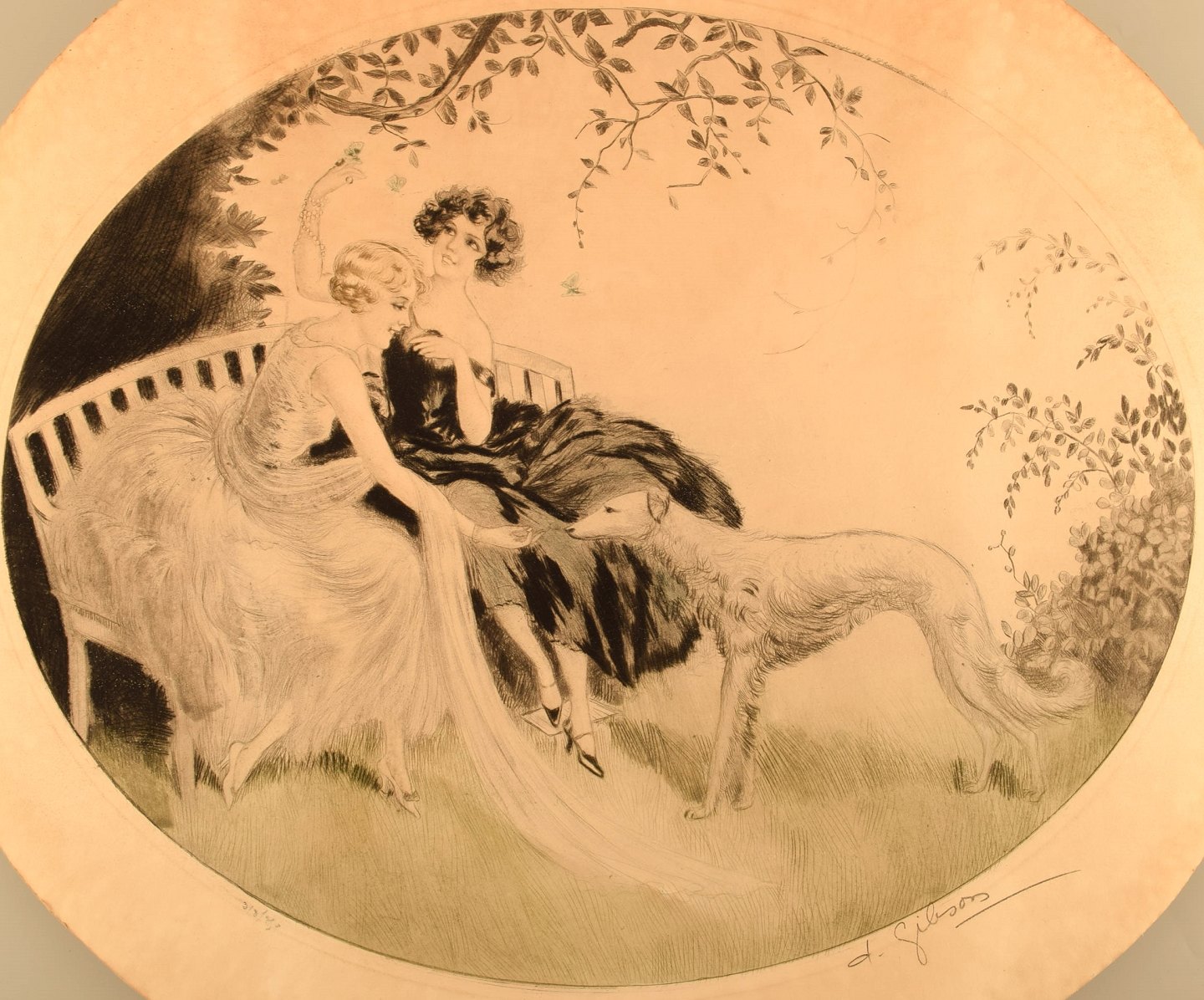 Charles Dana Gibson (1867-1944), amerikansk illustrator. Art deco litografi. To kvinder og hund. 1930'erne. # 318/750.