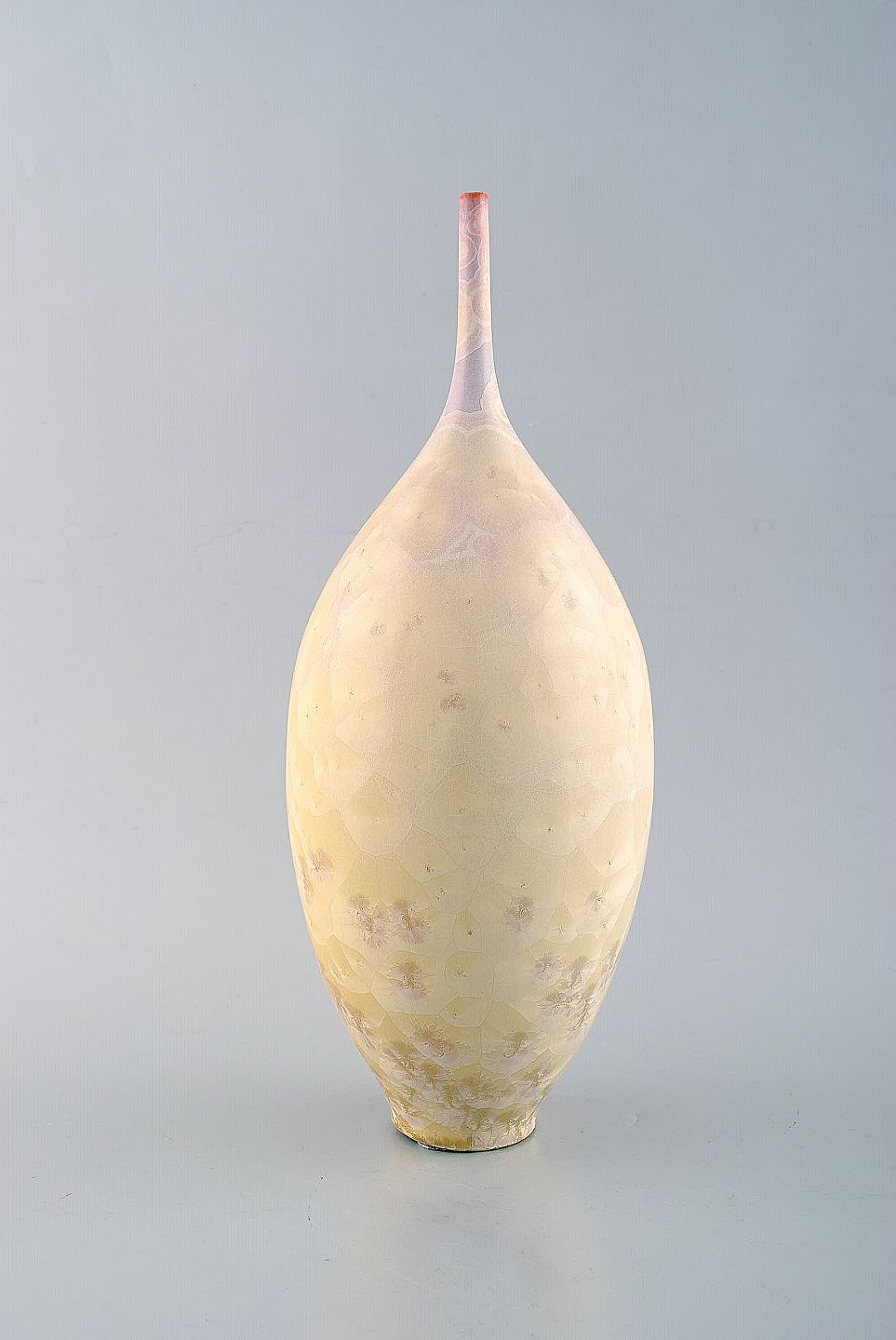 Isak Isaksson, svensk keramiker. Stor smalhalset unika vase i glaseret keramik. Smuk krystalglasur. Eget værksted, ca 2010. Samtidskeramik i høj kvalitet. I flot stand. Måler: 31 x 12 cm. Stemplet.