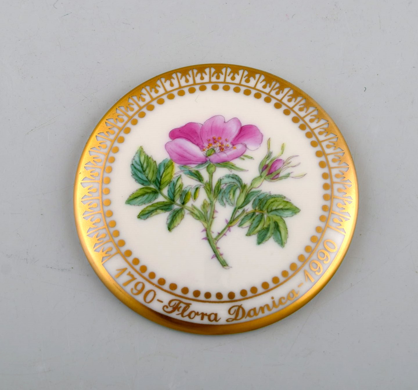 Royal Copenhagen Flora Danica sminkespejl i håndmalet porcelæn. Blomstermotiv og gulddekoration. 200-års jubilæum. Dateret 1990.