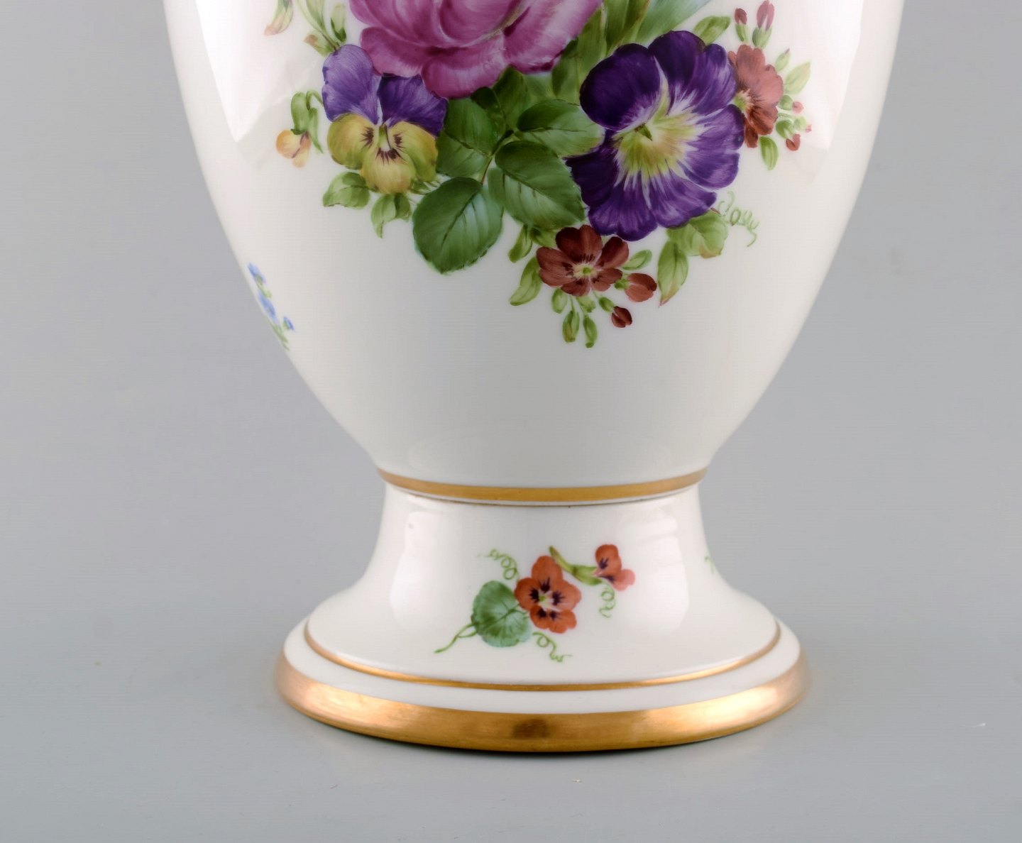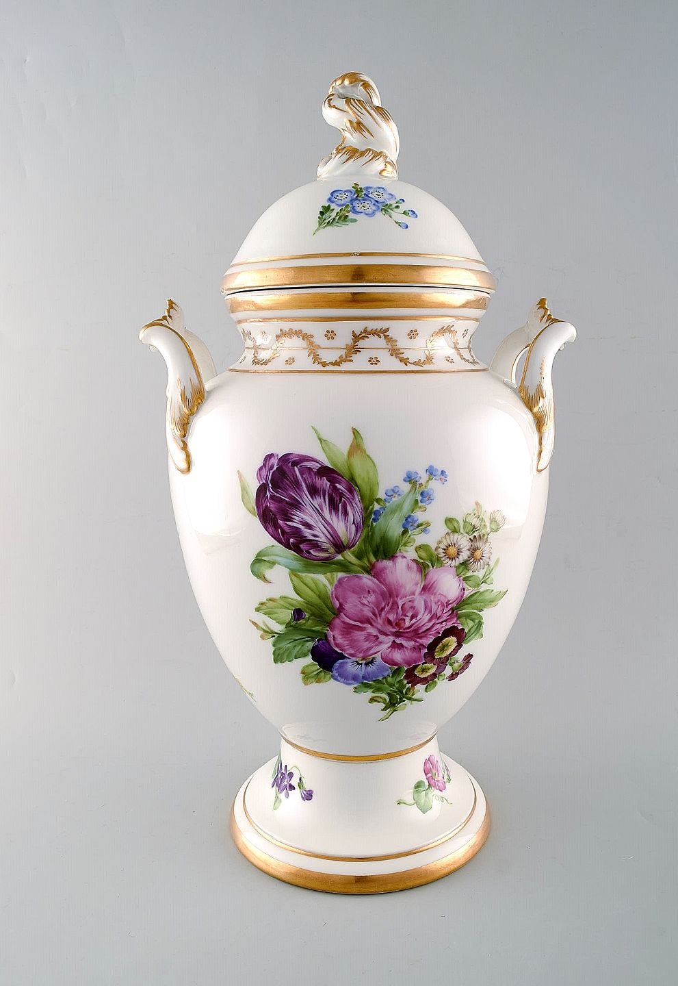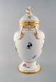 Royal Copenhagen. Antik balusterformet lågvase af porcelæn. Håndmalet i farver med blomster. Lågknop i form af rocaille og hanke i form af blad. Museumskvalitet. 1800-tallet.