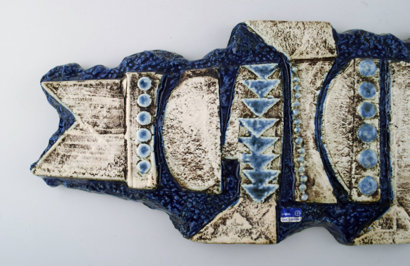 Lisa Larson for Gustavsberg. Kolossal og sjælden vægplakette i glaseret keramik i form af fisk. Nummer 80/150. 1960'erne.
