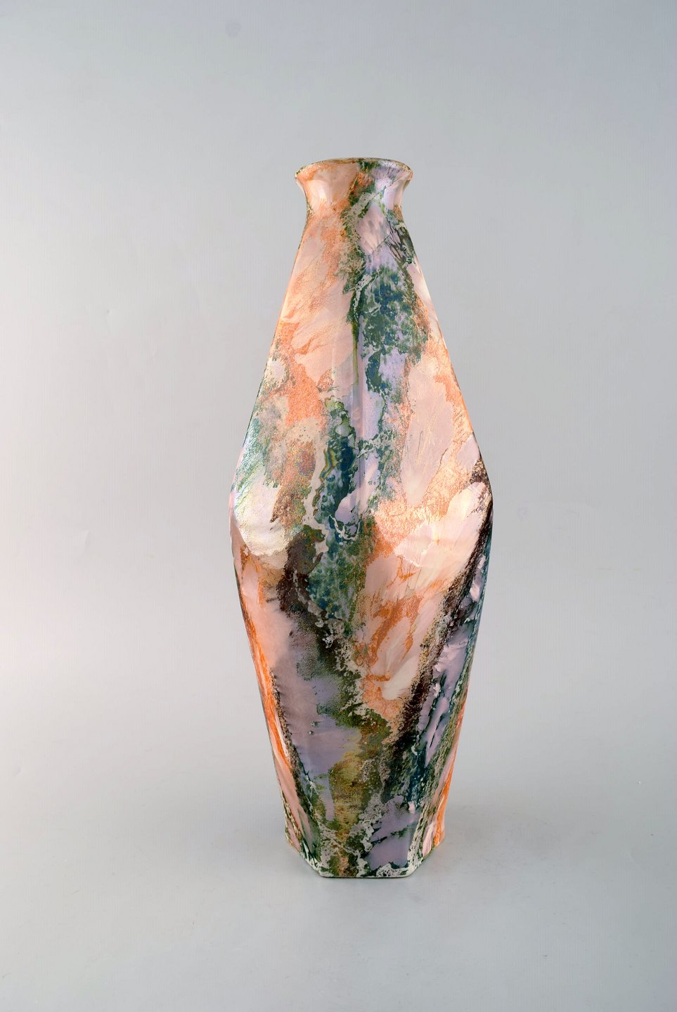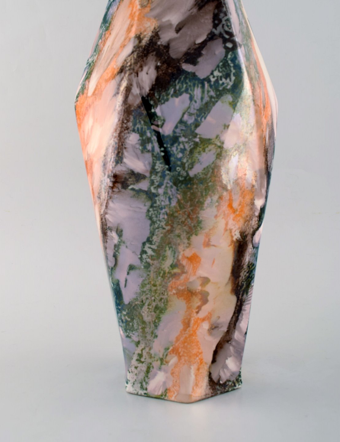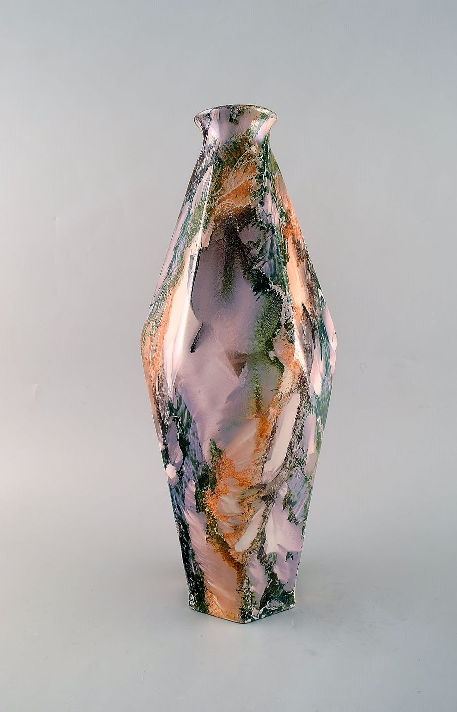Tidlig art deco Rörstrand vase i glaseret fajance. Glasur med smuk flerfarvet marmor effekt. Kantet form. Ca. 1920.