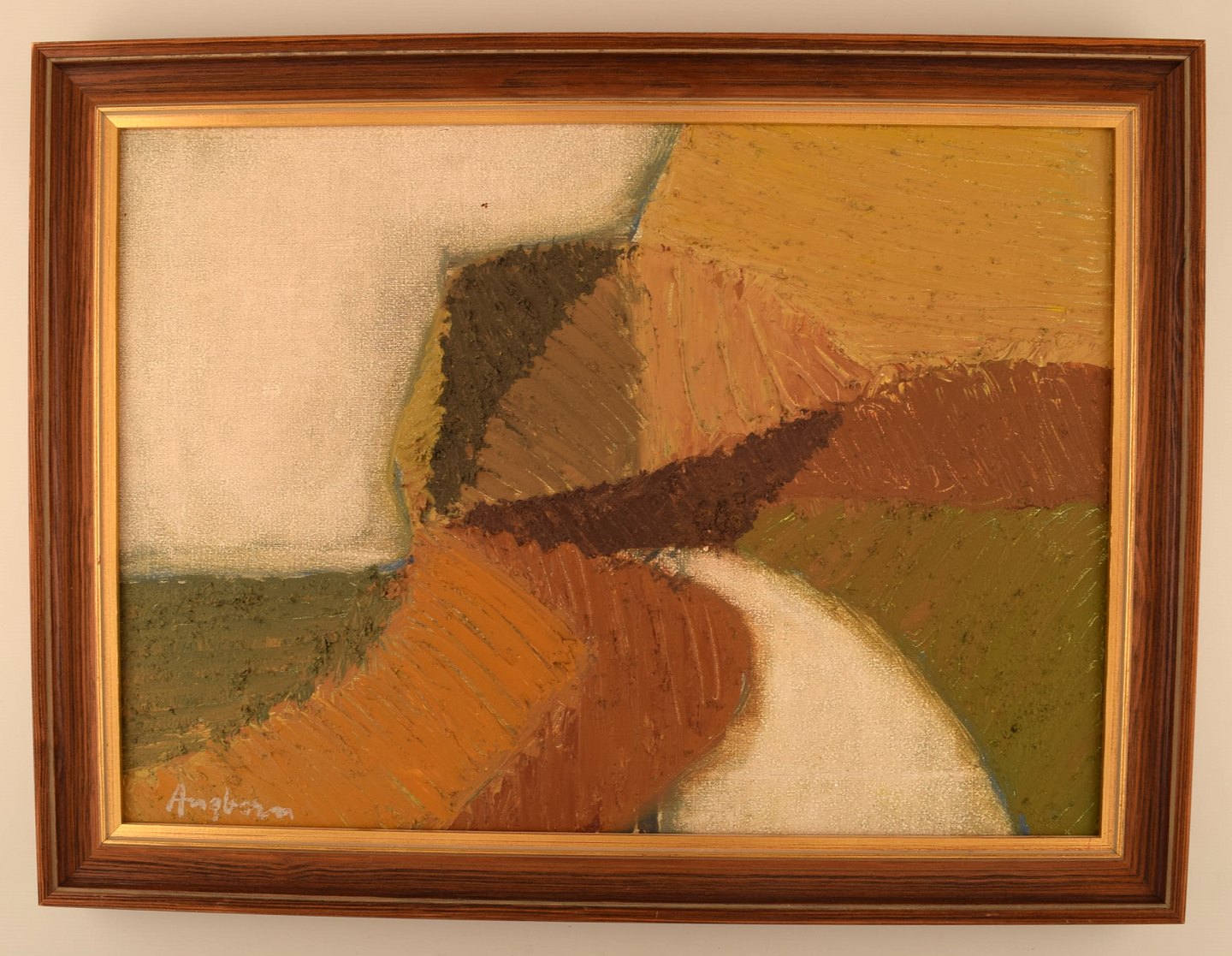 Sven Angborn (1925 - ), Svensk kunstner. Olie på lærred. Modernistisk landskab. Ca. 1970. I flot stand. Signeret. Pladen måler: 48 x 34 cm. Rammen måler: 4 cm.