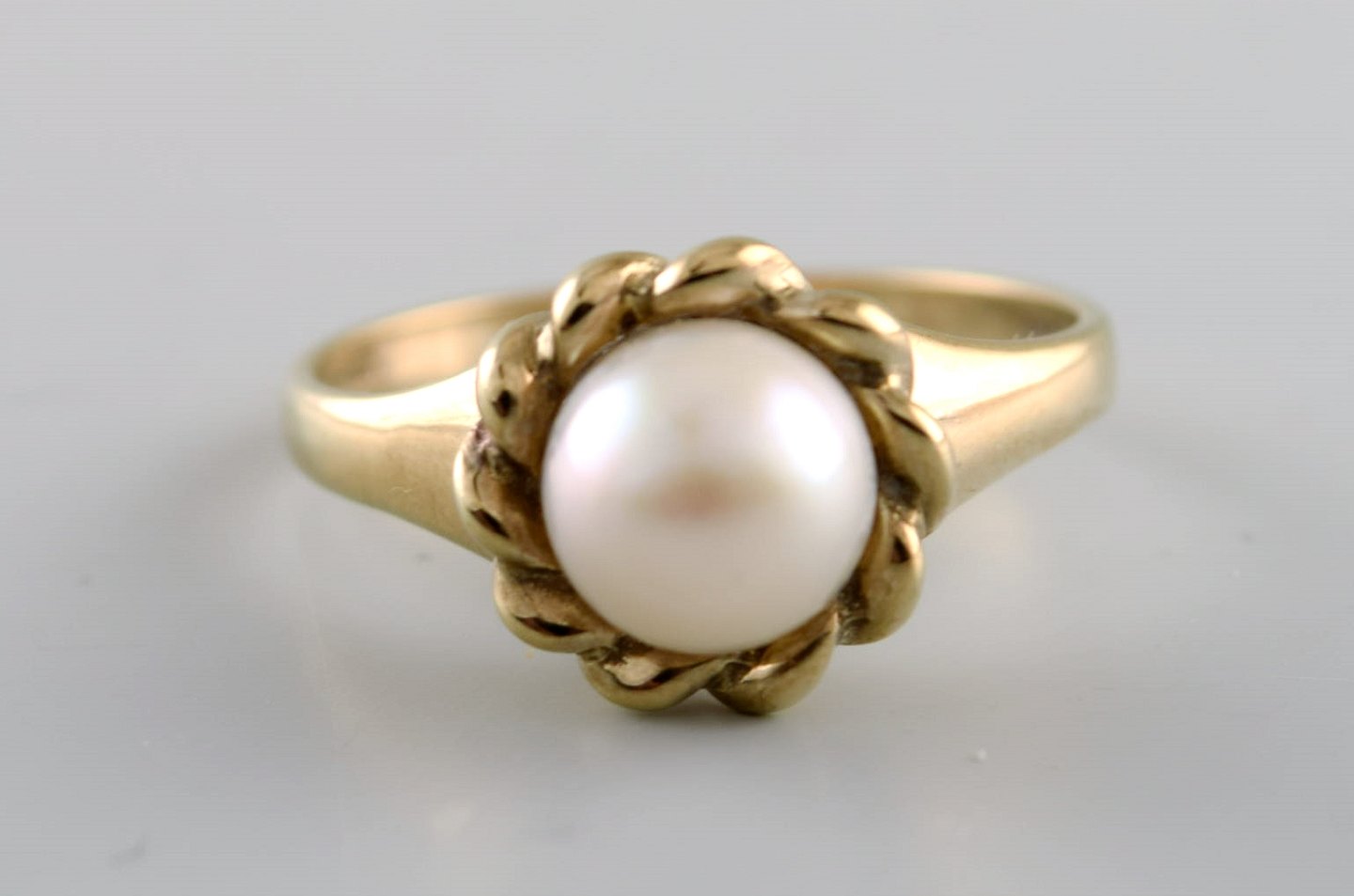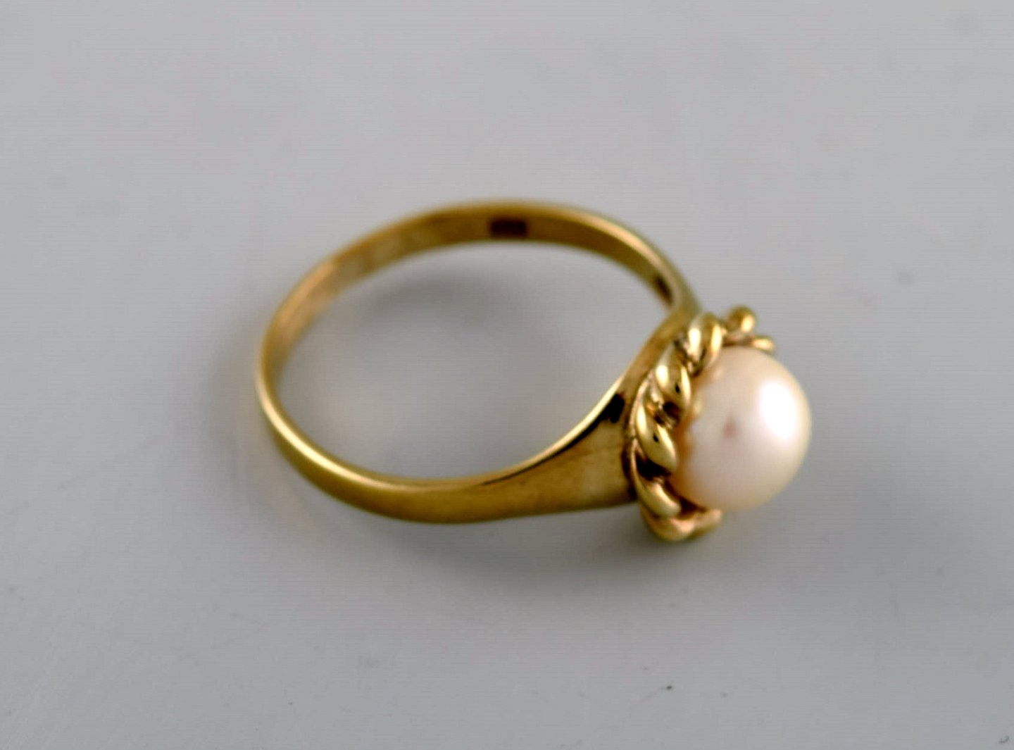 Skandinavisk guldsmed. 8 karat guldring prydet med kulturperle. 1930/40'erne. Diameter: 18 mm. US size: 7.75. I flot stand. Stemplet.