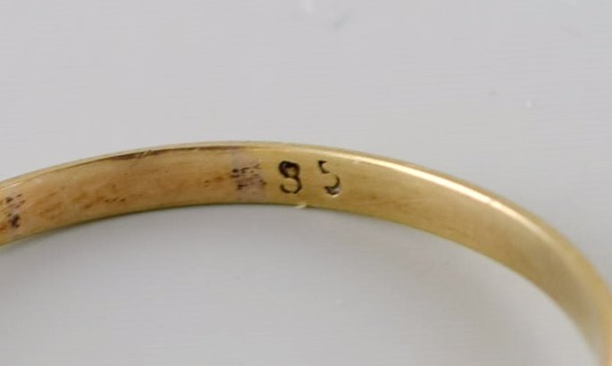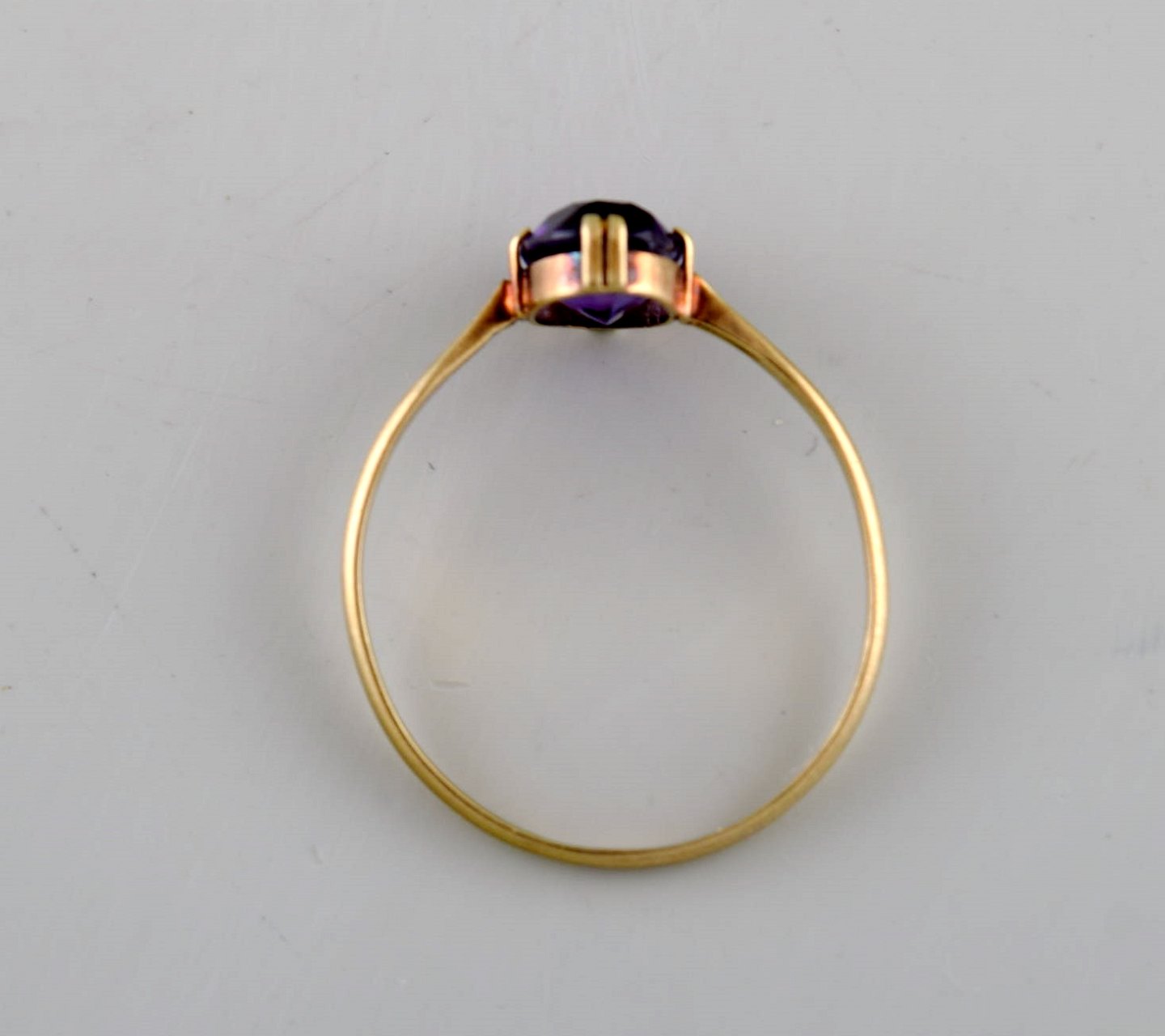 Skandinavisk guldsmed. 14 karat modernistisk guldring prydet med ametyst. Midt 1900-tallet. Diameter: 17,5 mm. US size: 7.25. I flot stand. Stemplet.