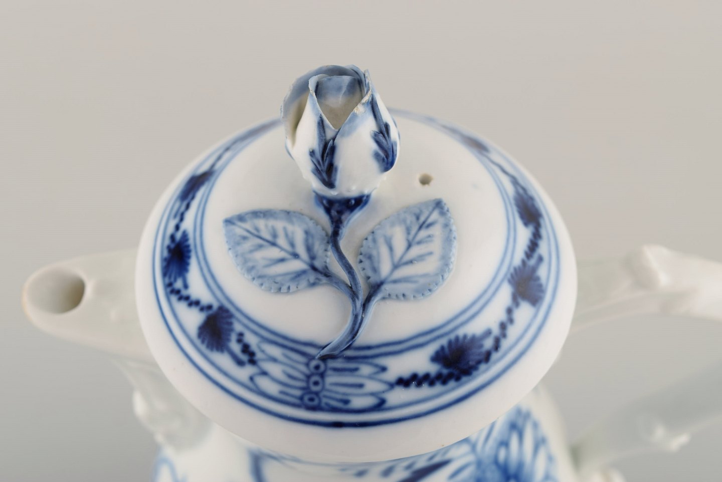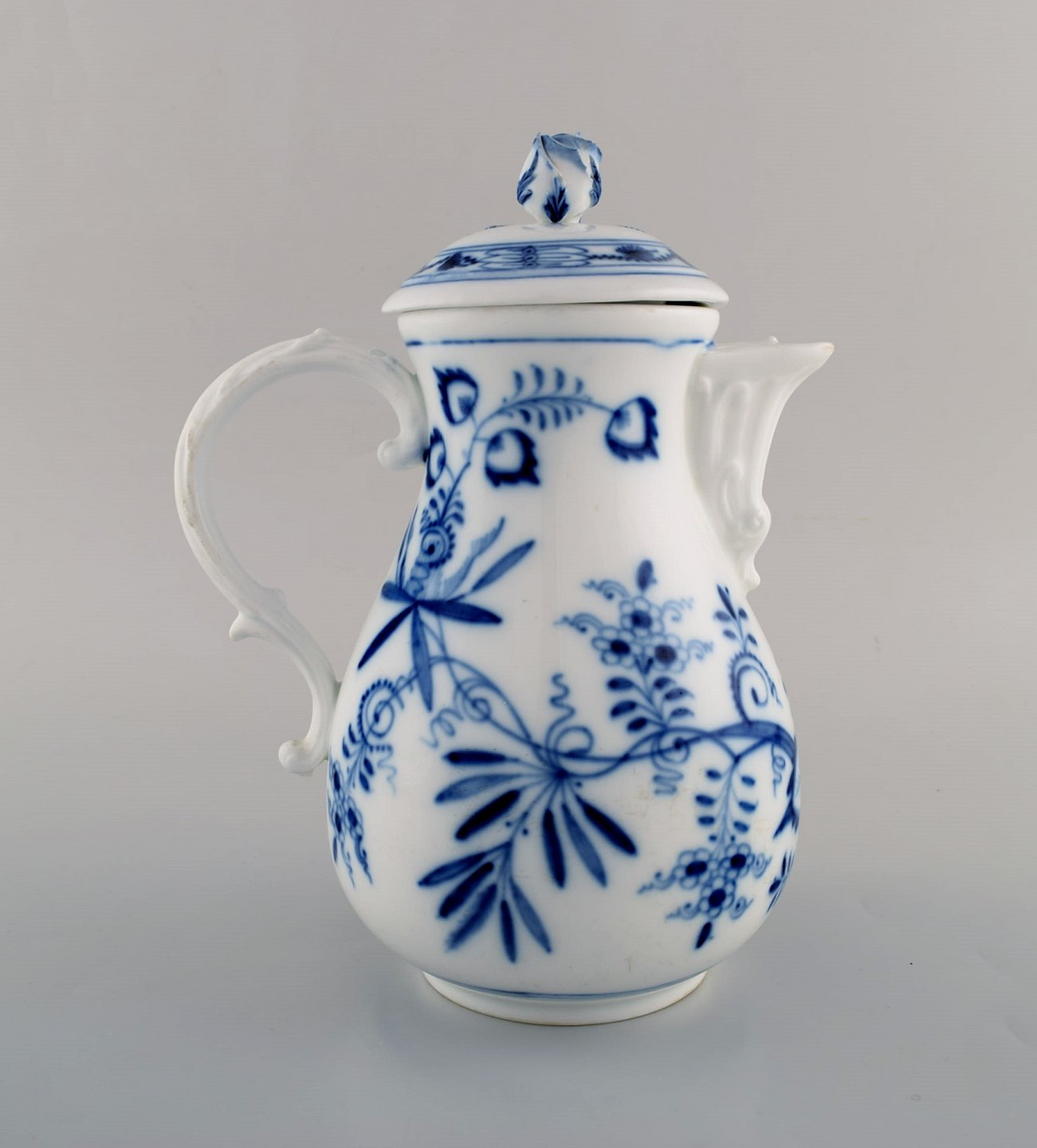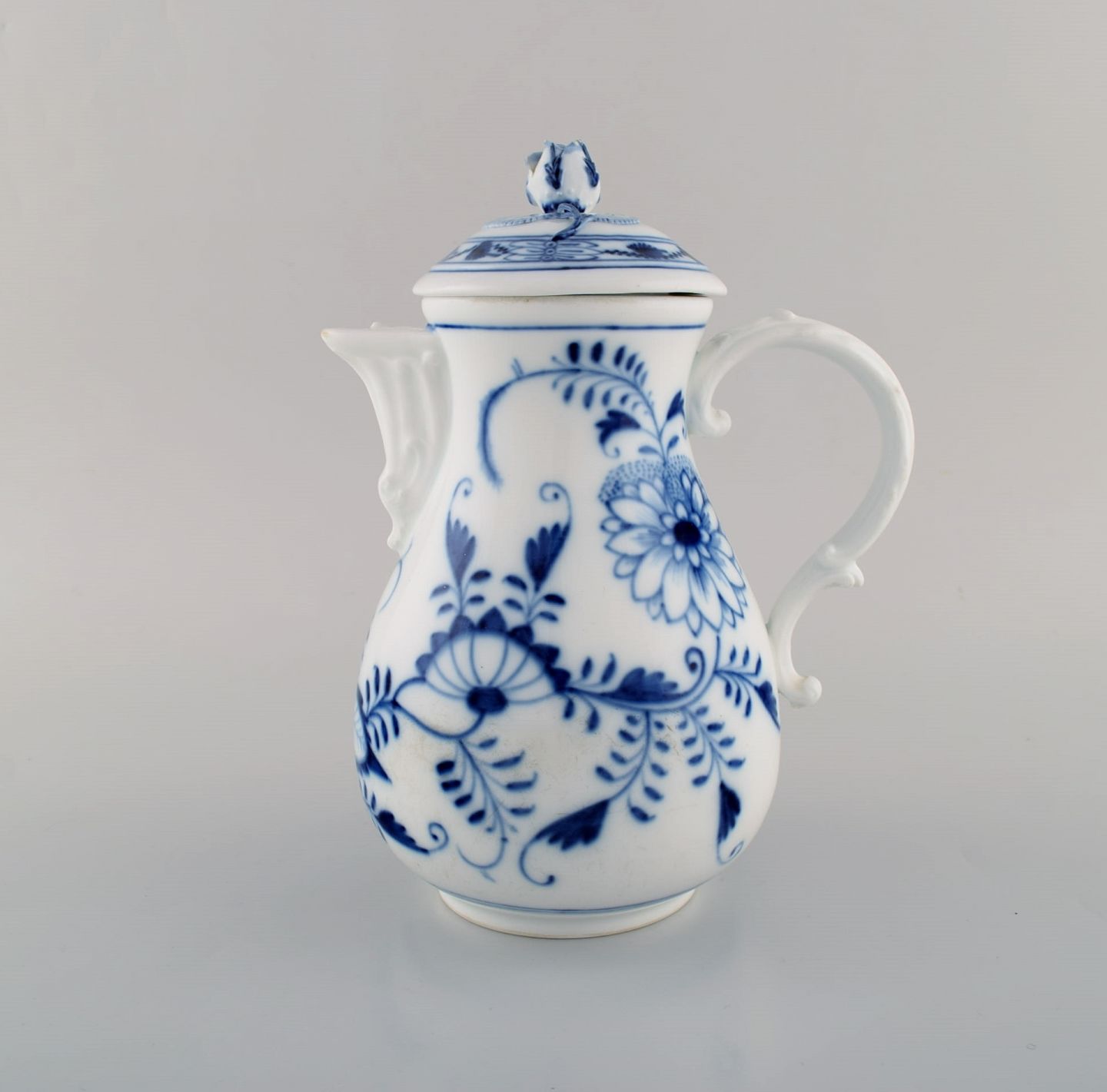 Antik Meissen "Løgmønstret" kaffekande i håndmalet porcelæn. Tidligt 1900-tallet. Måler: 23 x 18 cm. Stemplet. Indvendige skår i låget. 1. Sortering.