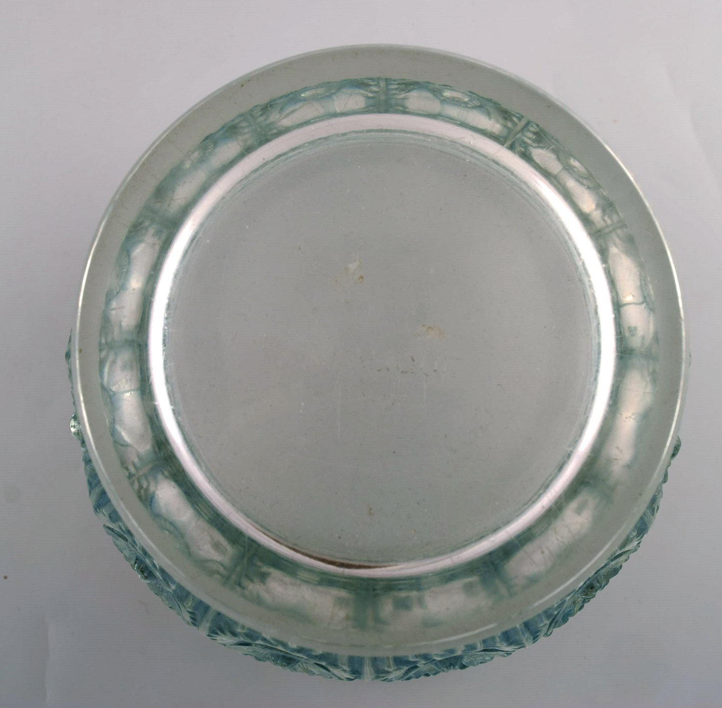 Tidlig René Lalique. Stor "Edelweiss" skål i turkis kunstglas dekoreret med blomster. Dateret 1937. Stemplet: R. Lalique. I flot stand. Måler: 19,5 x 15,5 cm.