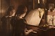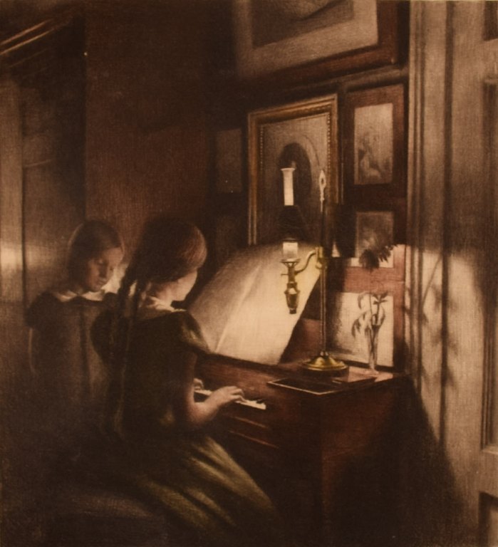 Peter Ilsted (1861-1933). Interiør med to piger ved klaveret. Radering. Ca. 1900.