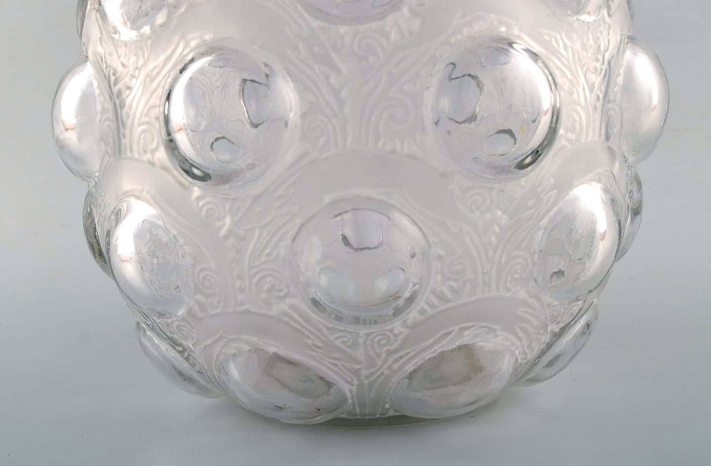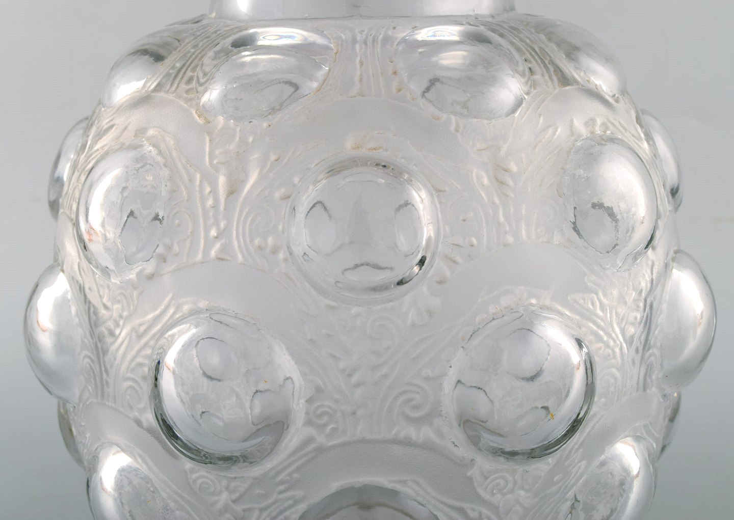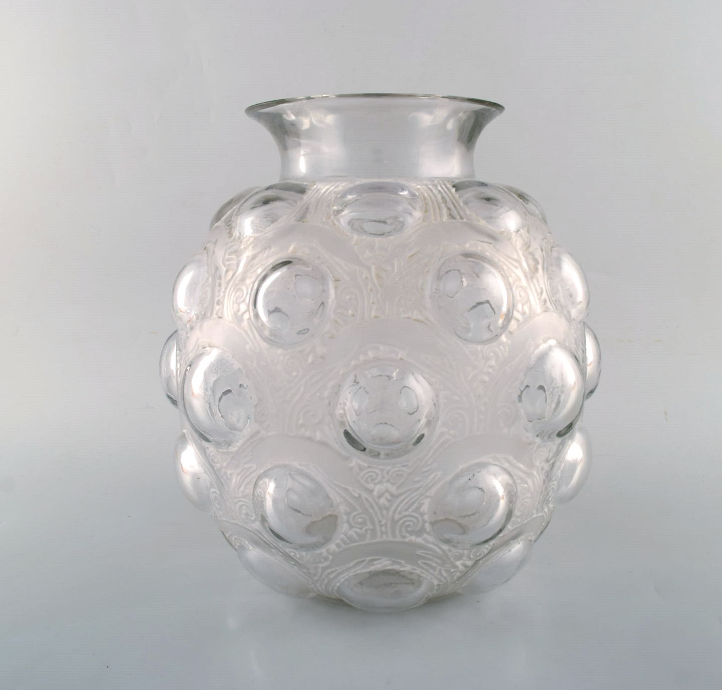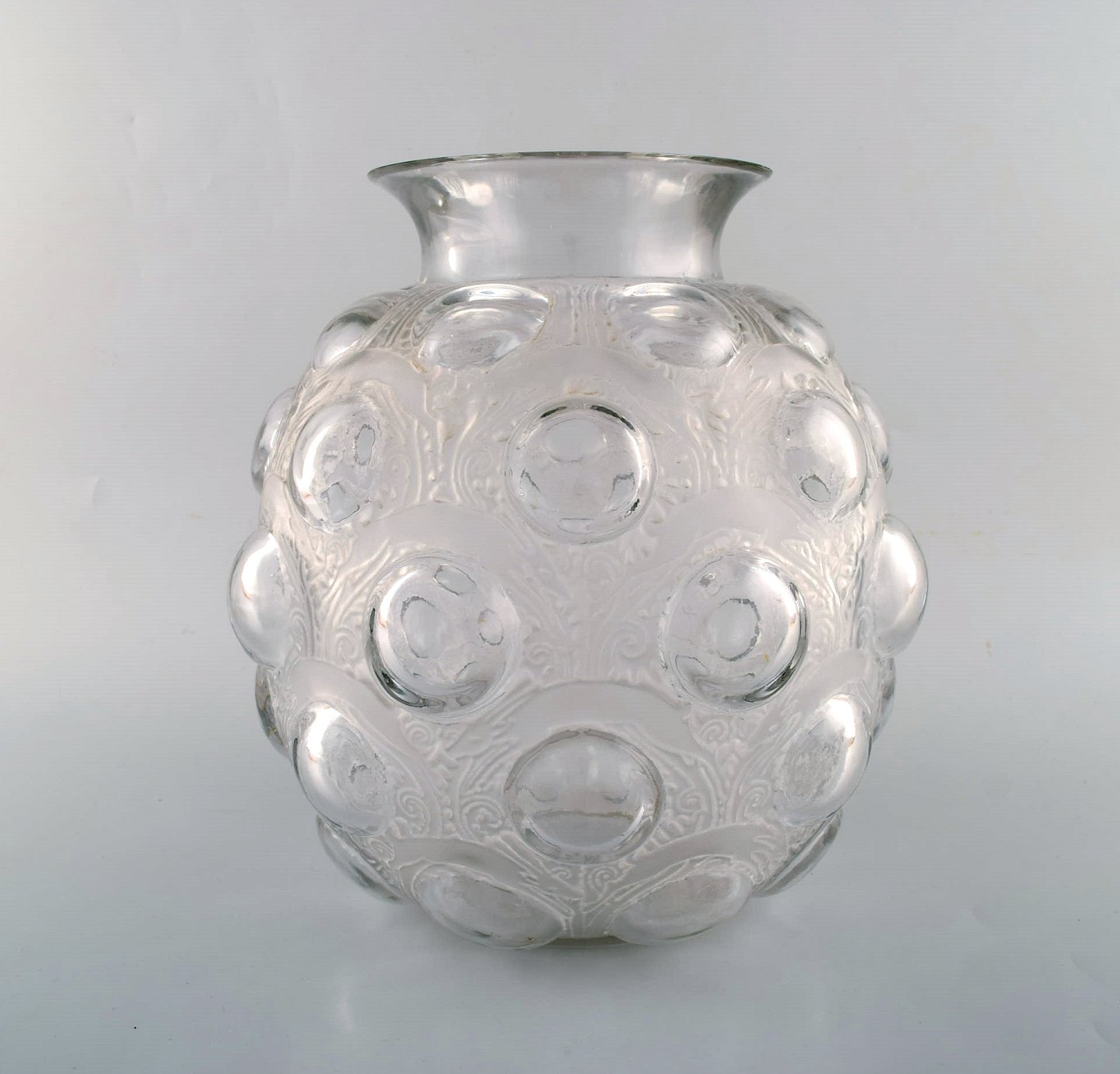 Stor og tidlig René Lalique. Sjælden "Antilopes" vase i kunstglas med springende antiloper. Modelnummer 875. Designet 1925. Stemplet: R. Lalique. I flot stand. Måler: 27,5 x 26 cm.