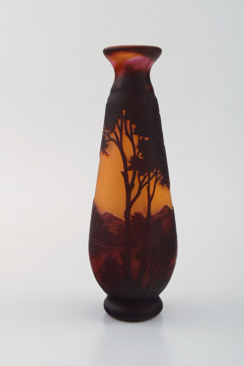 Emile Gallé, Frankrig. "Paysage" vase i mundblæst kunstglas. Motiv af landskab med solnedgang. Ca. 1900. I flot stand. Måler: 21 x 7,5 cm. Signeret: Gallé.