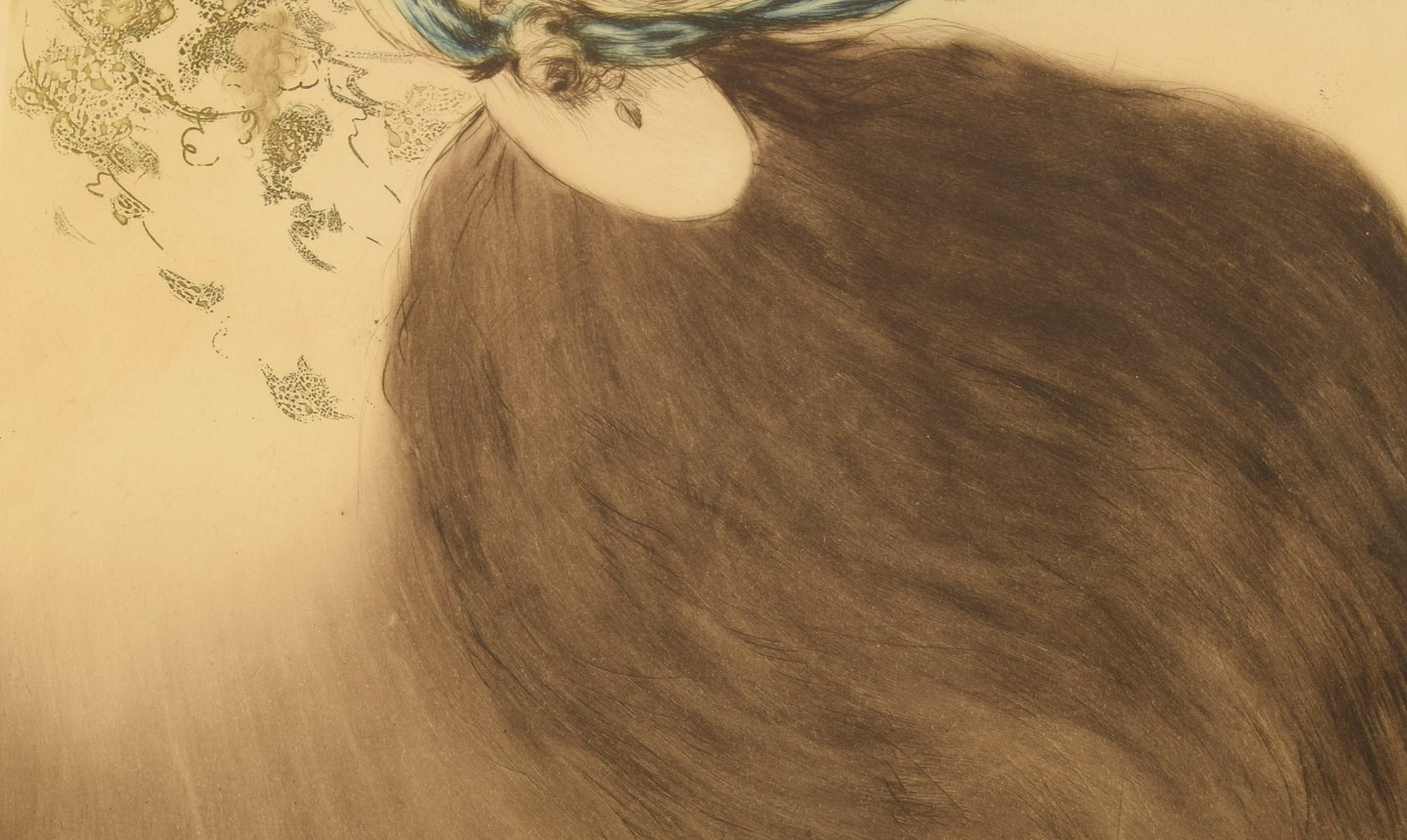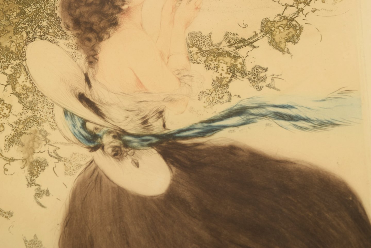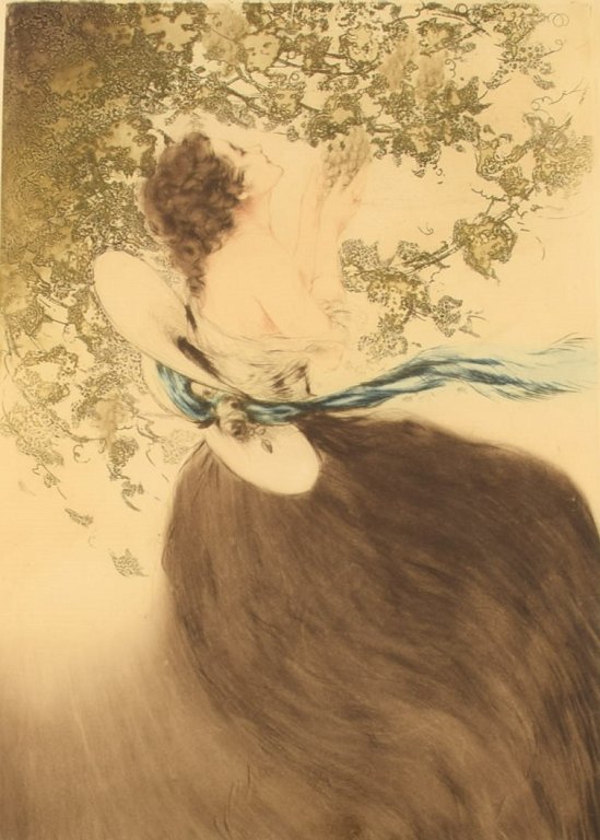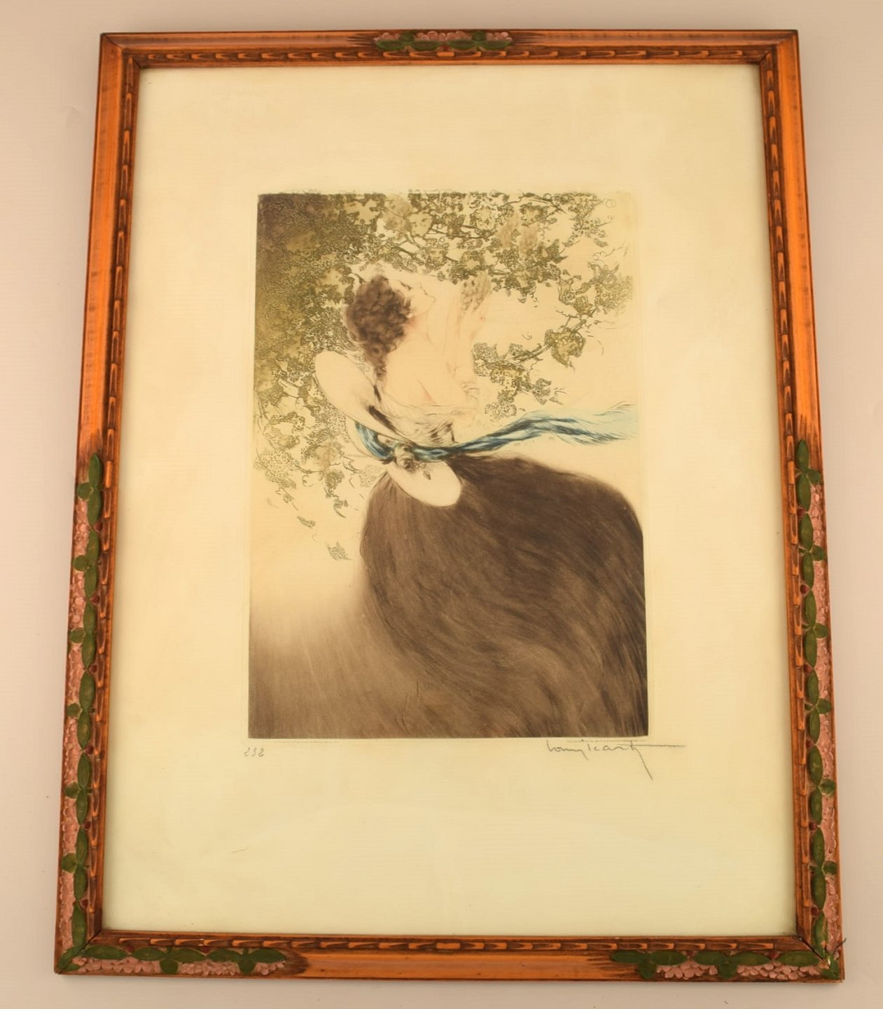 Louis Icart (1888-1950). Radering på papir i smuk håndudskåret art nouveau ramme. Ung kvinde plukker druer. Nummer 232. Ca. 1920.