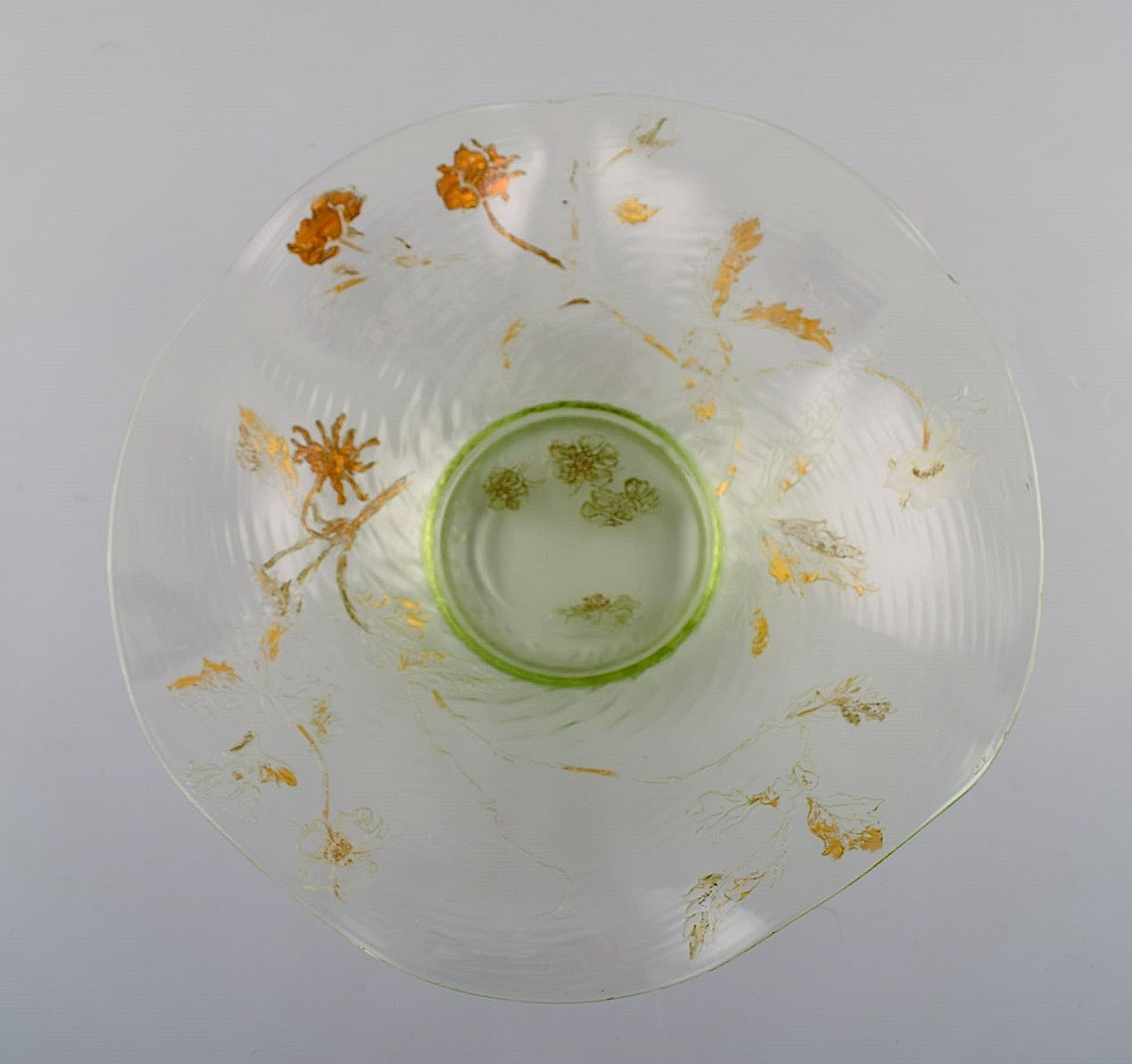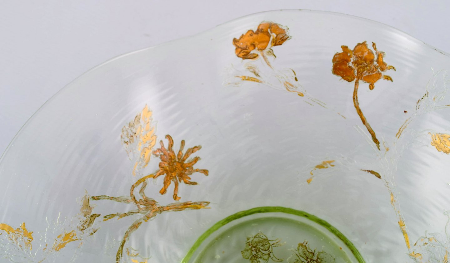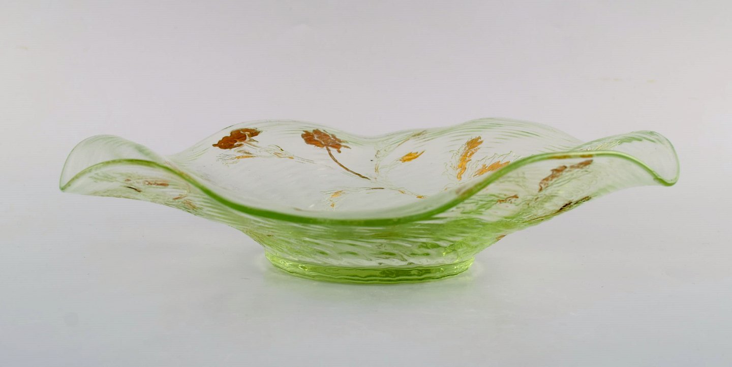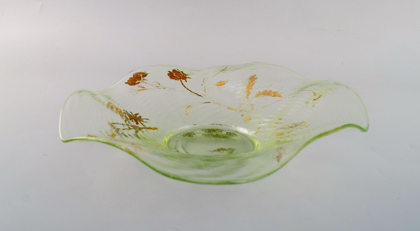 Emile Gallé, Frankrig. Antik skål i mundblæst kunstglas med håndmalede blomsterdekorationer i guld. 1870/80'erne. Måler: 24 x 5 cm. I flot stand med slid i guldet. Signeret.