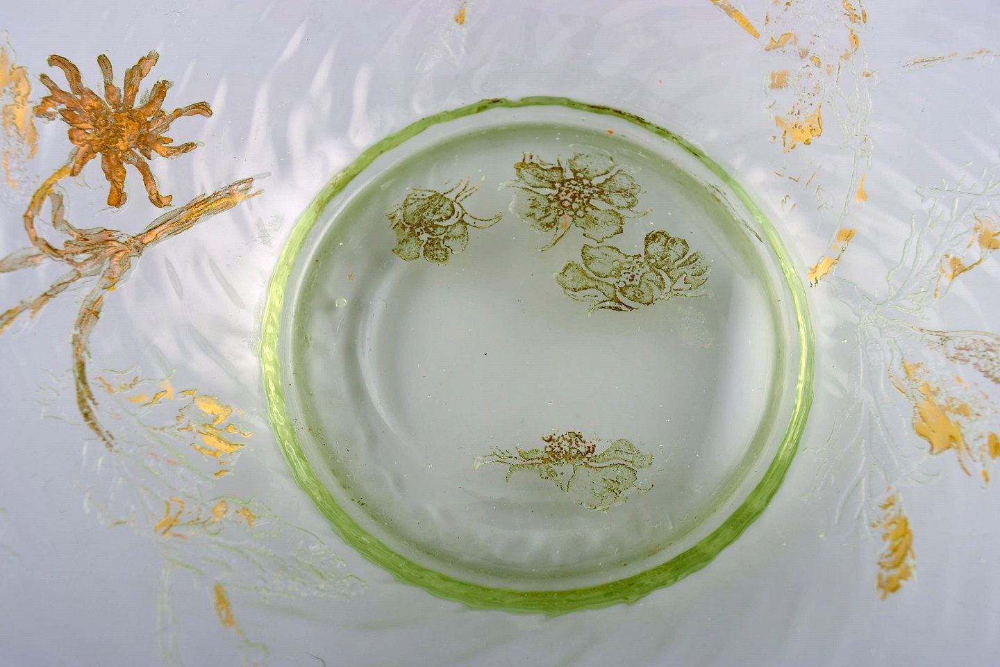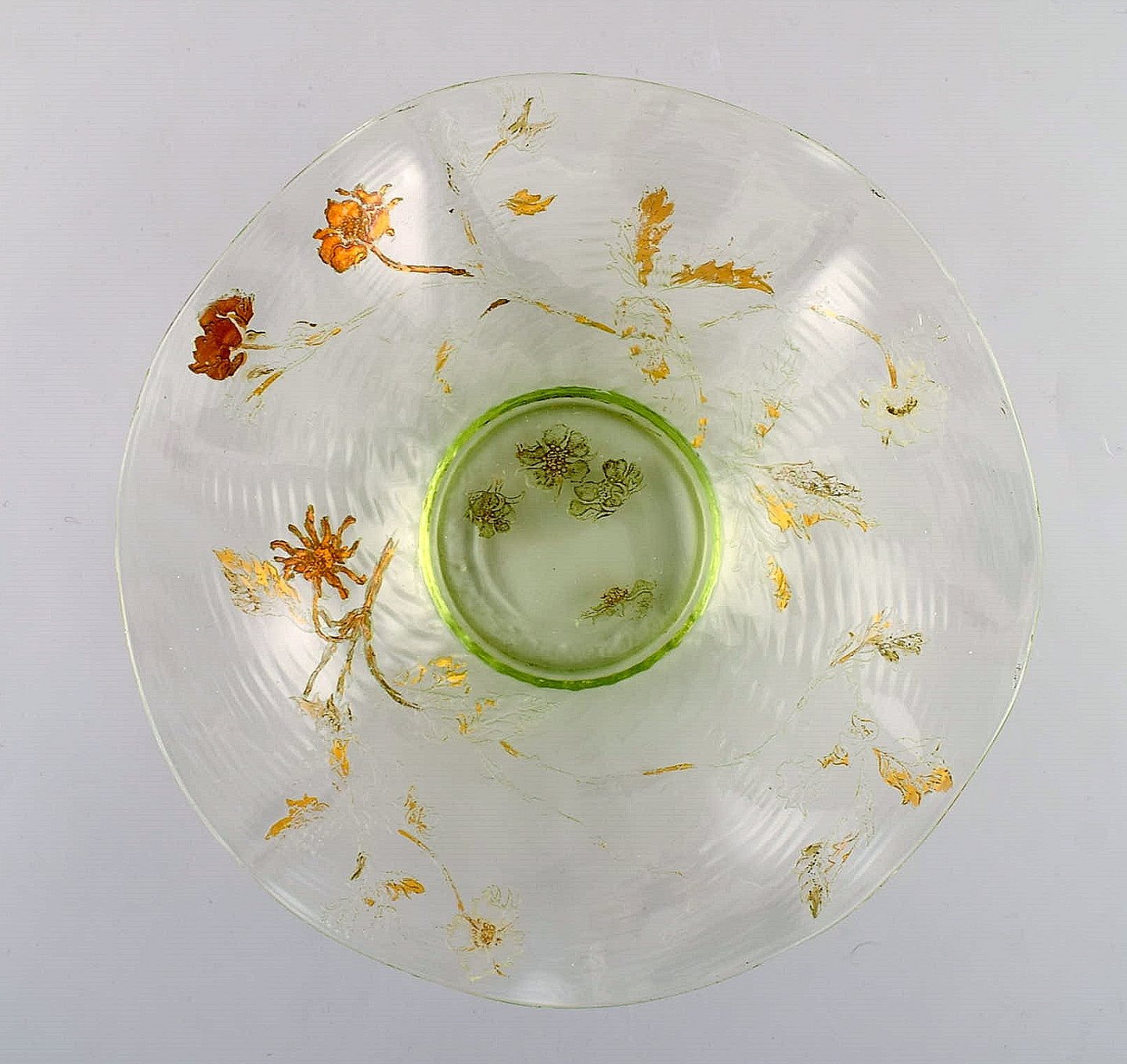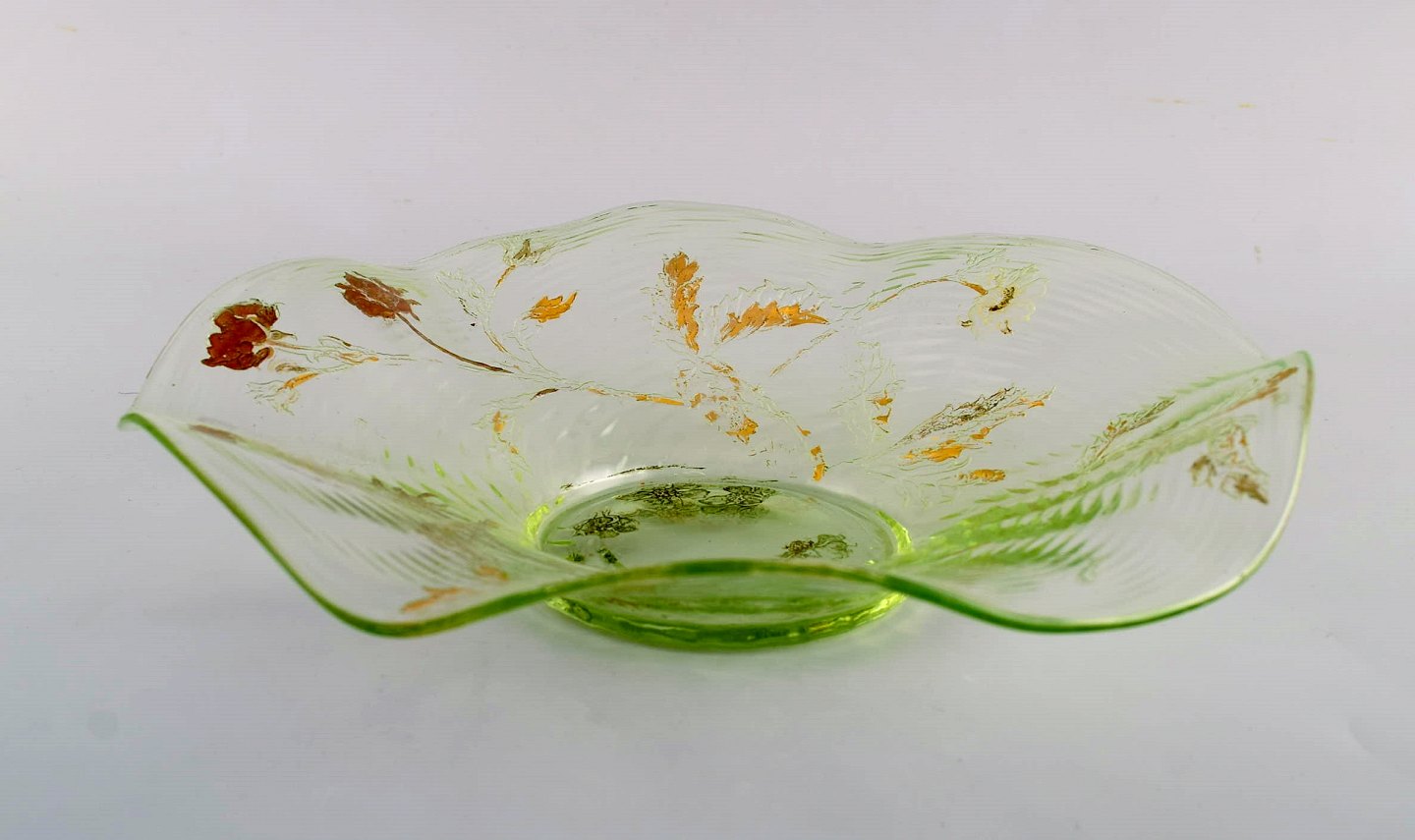 Emile Gallé, Frankrig. Antik skål i mundblæst kunstglas med håndmalede blomsterdekorationer i guld. 1870/80'erne. Måler: 24 x 5 cm. I flot stand med slid i guldet. Signeret.