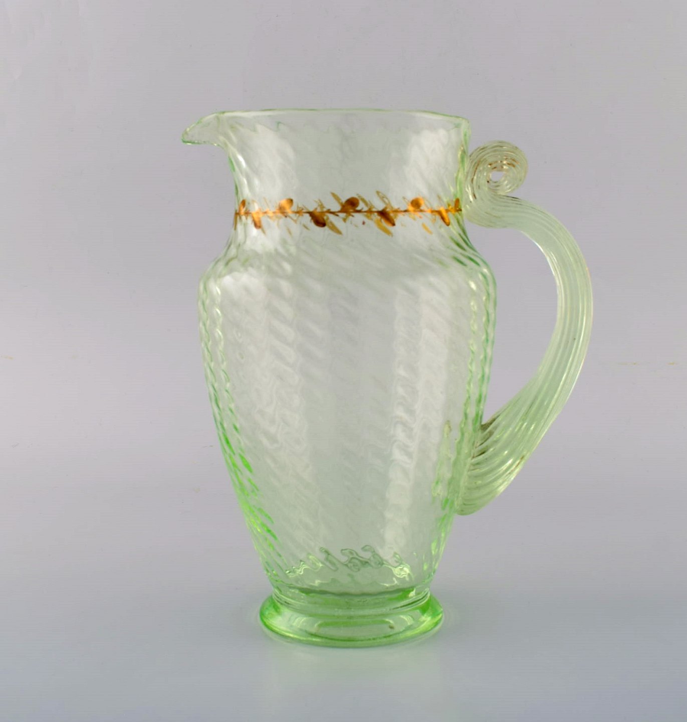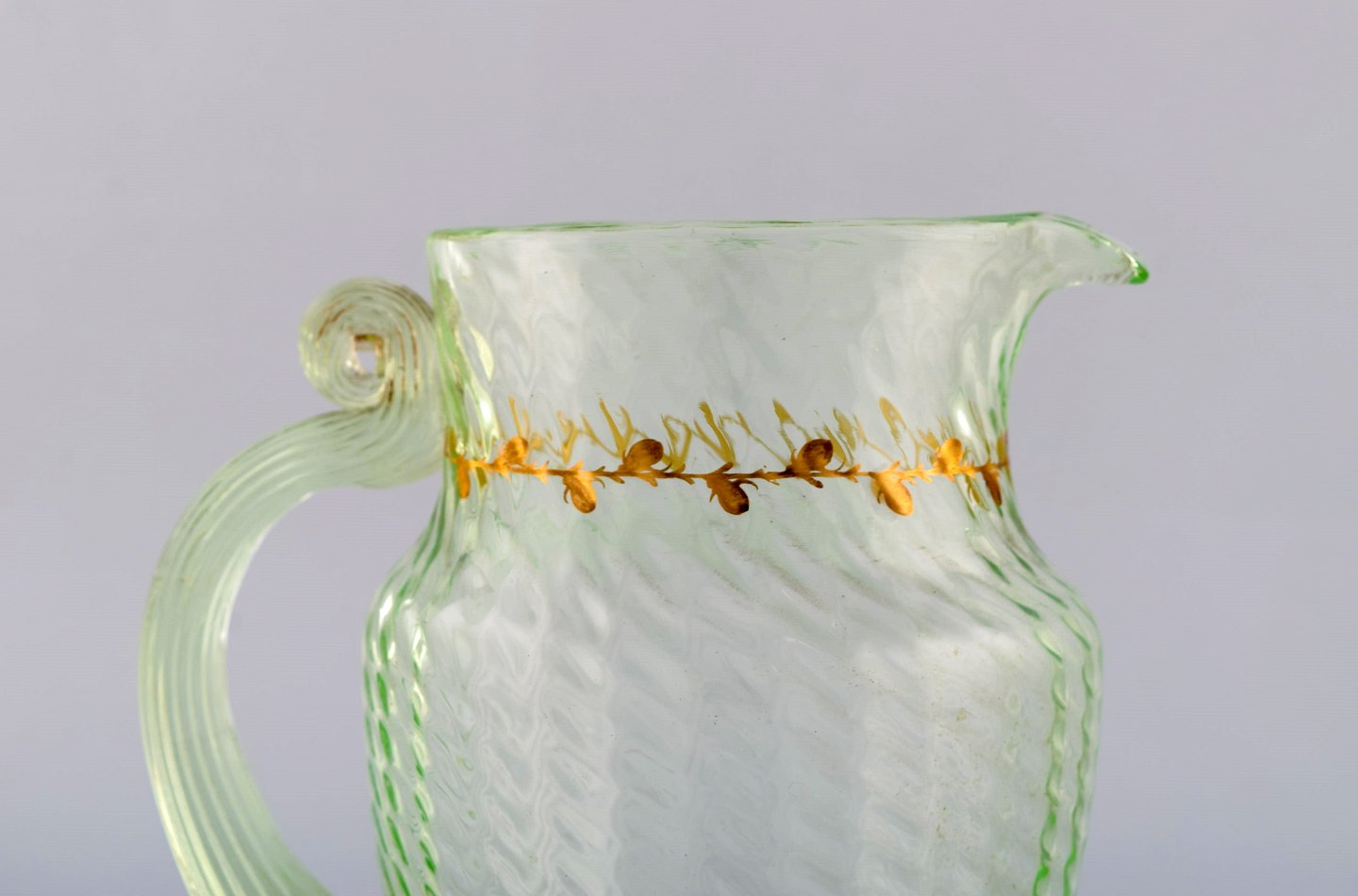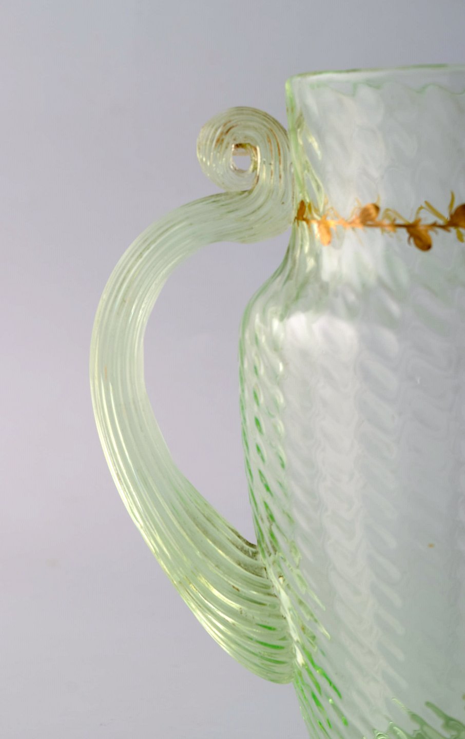 Emile Gallé (1846-1904). Tidlig og sjælden kande i mundblæst lysegrønt kunstglas med håndmalede guldekorationer i form af blade. Museumskvalitet, 1870/80'erne.